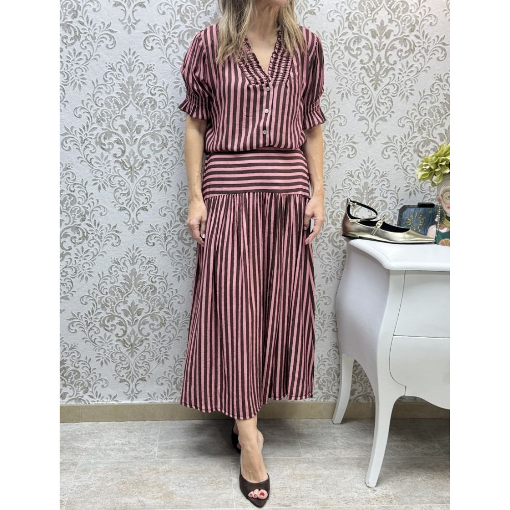 Conjunto de dos piezas confeccionado en tejido ligero con estampado de rayas verticales en tonos aguamarina y crudo. La parte superior consiste en una blusa de manga corta abullonada con acabados elásticos fruncidos, cuello mao con detalle de pechera plisada y cierre frontal de botones. La parte inferior es una falda de largo midi con cinturilla ancha con elástico en la trasera.
