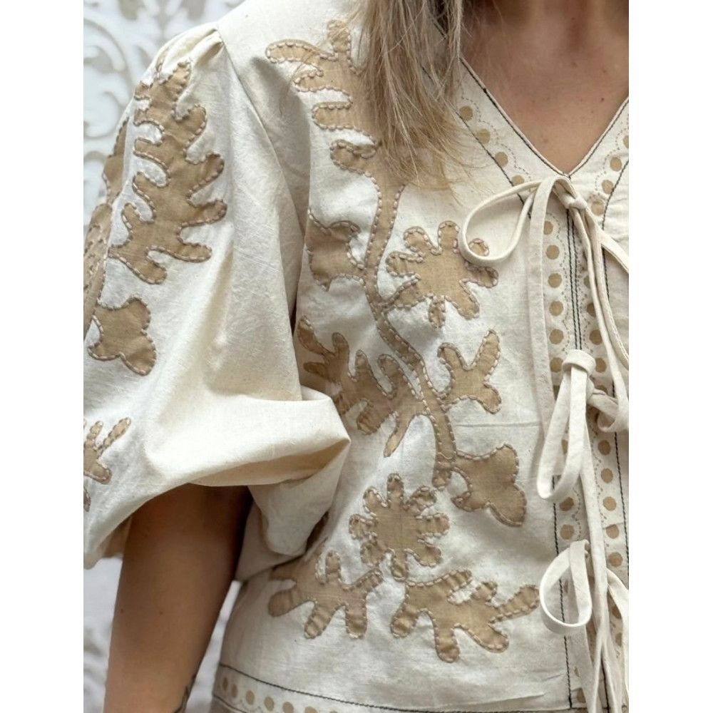 Conjunto de dos piezas confeccionado en tejido con apariencia de lino en color crudo, compuesto por un top de escote en "V" tiene cordones lazados decorativos y mangas abullonadas, junto a un pantalón de pernera ancha con bolsillos laterales. Ambas prendas presentan aplicaciones de bordado artesanal en relieve de color arena con motivos botánicos y ribetes geométricos en los bajos y el escote.