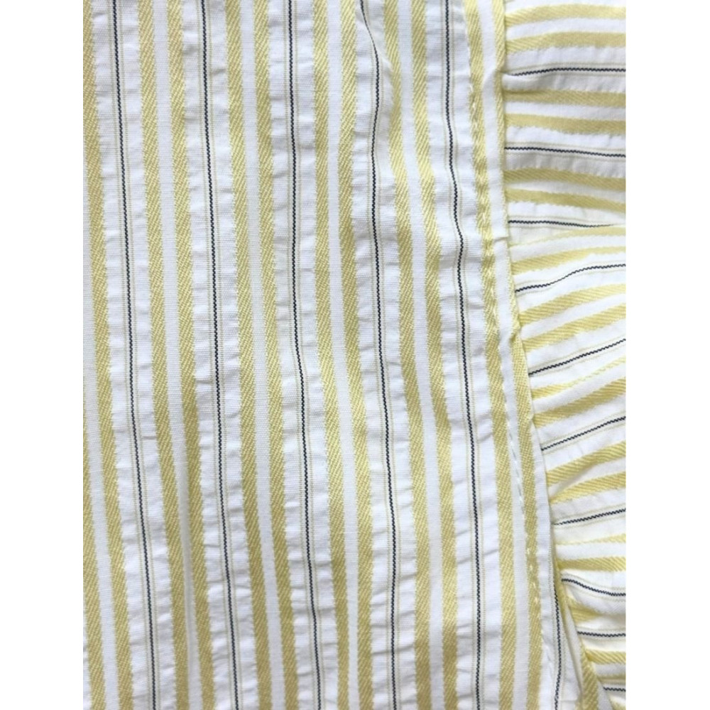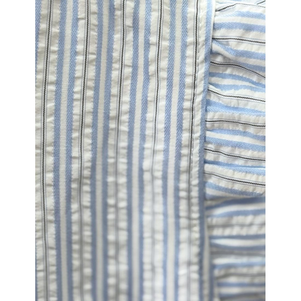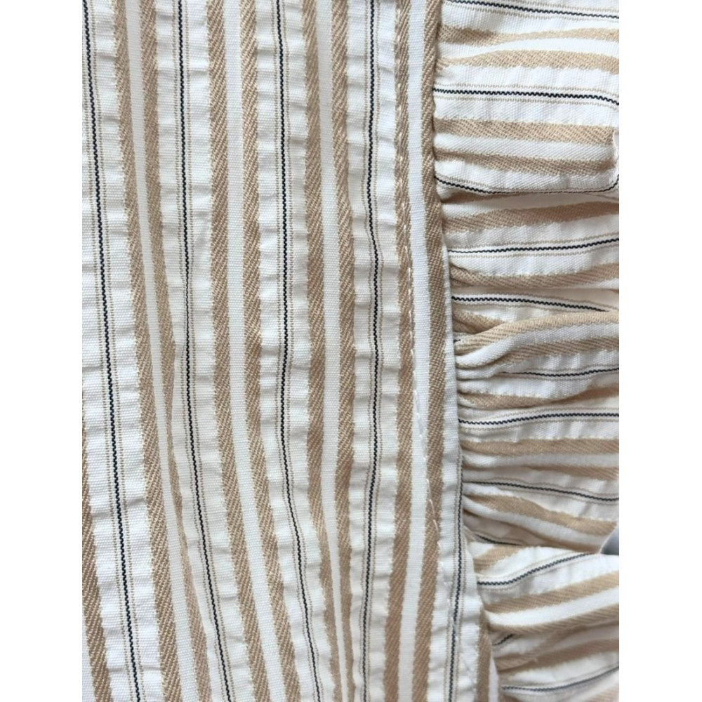 Conjunto de dos piezas confeccionado en tejido ligero con estampado de rayas verticales. El top es sin mangas, con escote en pico ribeteado por un volante plisado, cierre frontal parcial de botones y detalle de volante en la sisa. Se combina con una falda midi de talle alto con fajín liso en la cintura, cuerpo fruncido que aporta volumen y caída fluida.