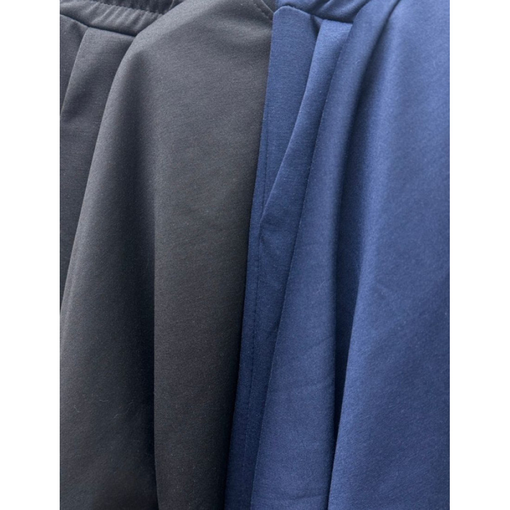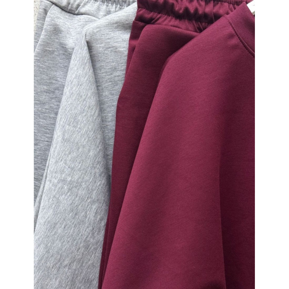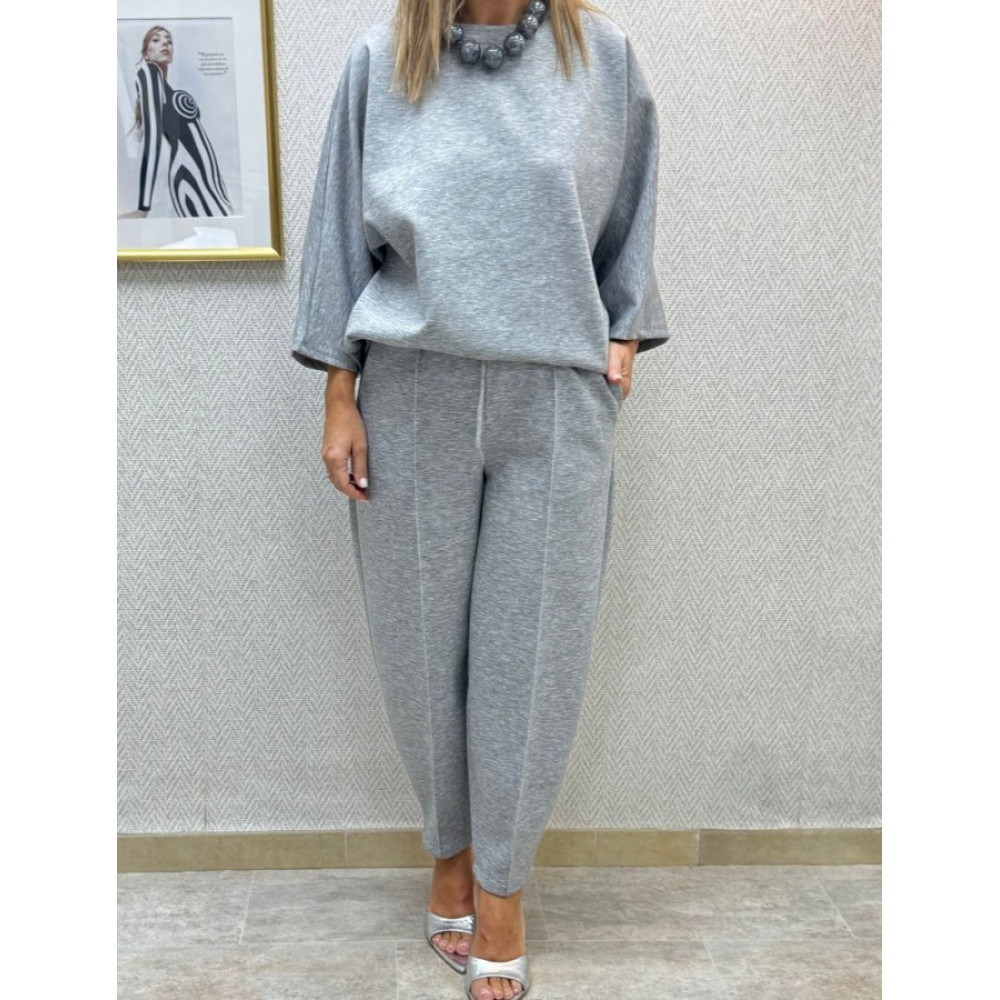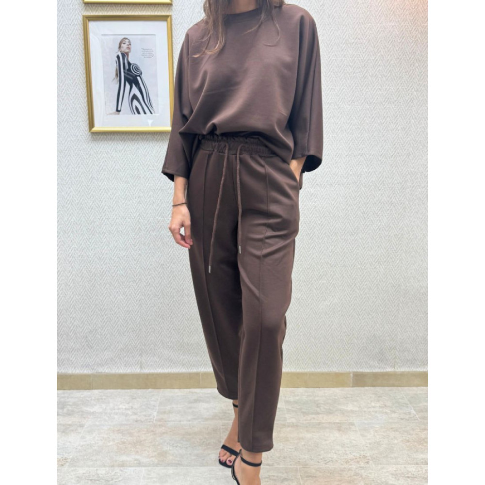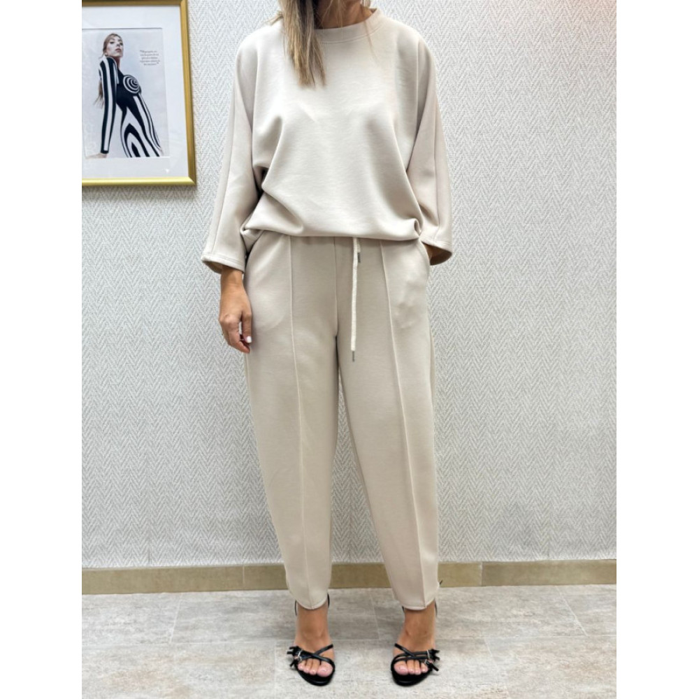 Conjunto de chándal de dos piezas. La parte superior es una sudadera de cuello redondo con manga francesa amplia y hombro caído. El pantalón es de corte jogger con cintura elástica ajustable mediante cordón y bolsillos laterales. El tejido del conjunto es liso y de punto.