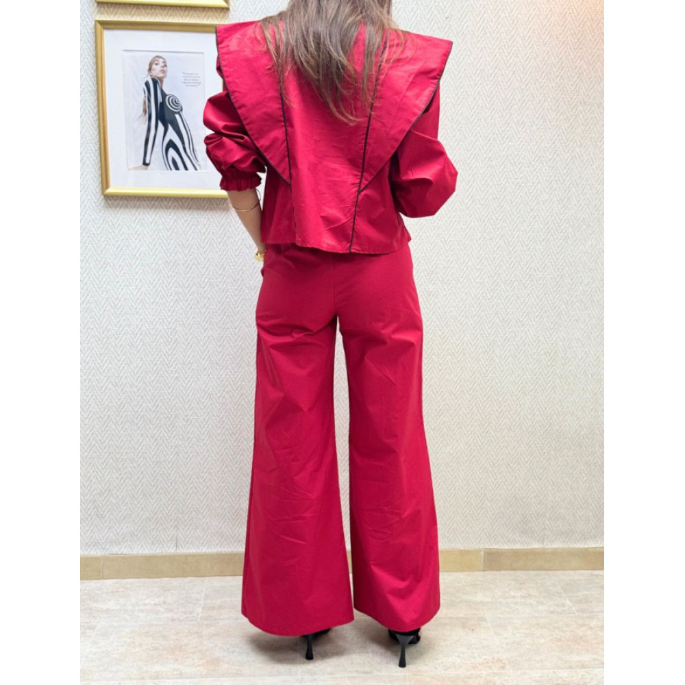 Conjunto de dos piezas compuesto por blusa y pantalón. La blusa es de cuello redondo con un amplio volante superpuesto que cubre los hombros y parte del pecho. Presenta manga larga abullonada con puño elástico. El pantalón es de tiro alto y pierna ancha palazzo. Ambas prendas tienen un detalle de ribete en color oscuro que perfila los volantes y las costuras centrales del pantalón. El tejido es liso y con cuerpo.