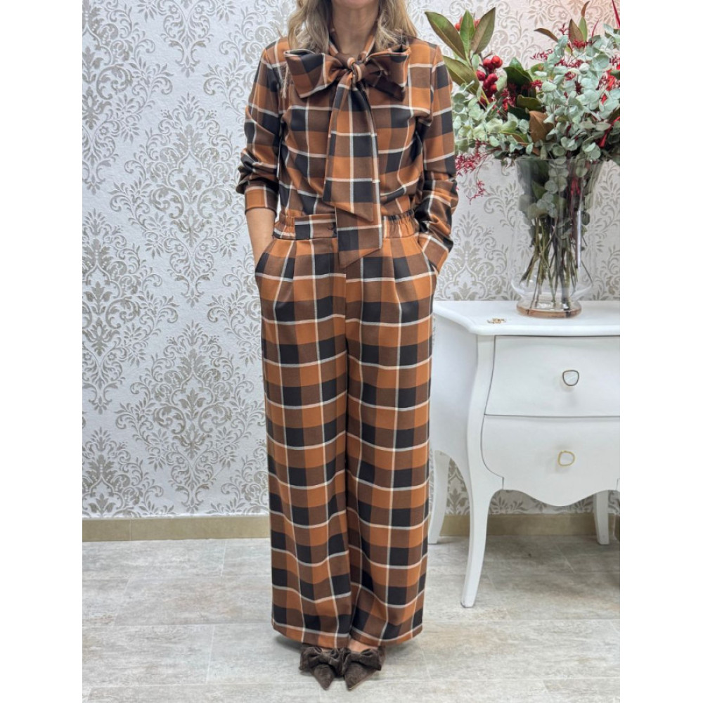 Conjunto de dos piezas confeccionado en tejido con estampado de cuadros en tonos café y naranja.