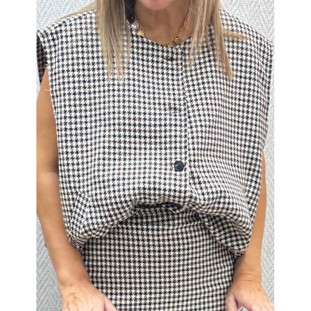 Chaleco sin mangas de corte globo en tejido de pata de gall en tonos negro, blanco y marrón. Presenta cuello perkins y cierre frontal de botones a contraste. Confeccionado en un material similar a la lana tweed.