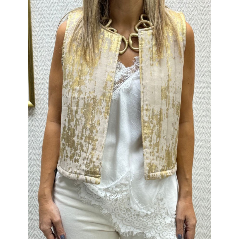 Chaleco de corte cropped y silueta ajustada, confeccionado en tejido acolchado con un acabado metalizado con efecto desgastado. Presenta un diseño sin mangas, cuello redondo y un cierre frontal abierto. El bajo y los bordes son rectos.