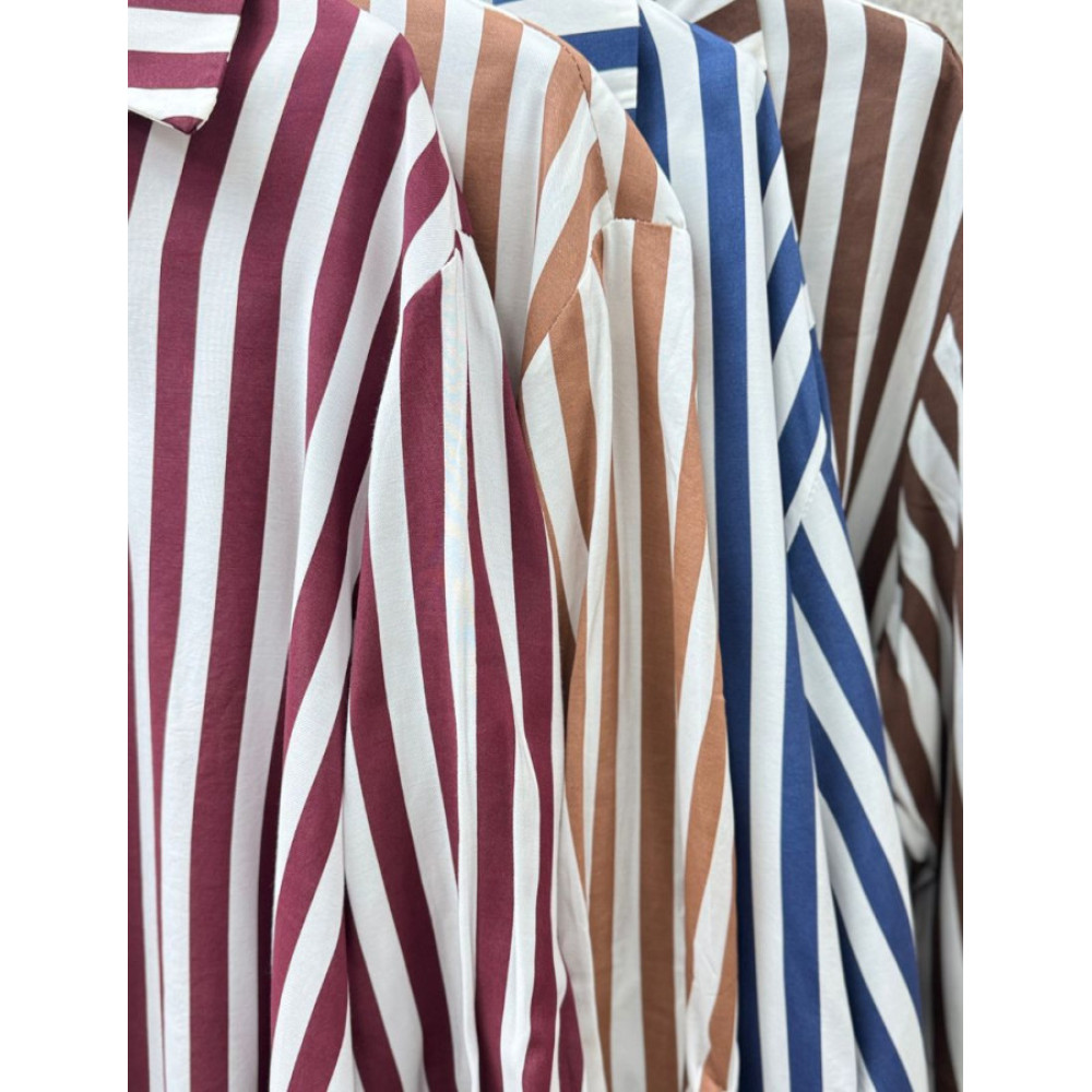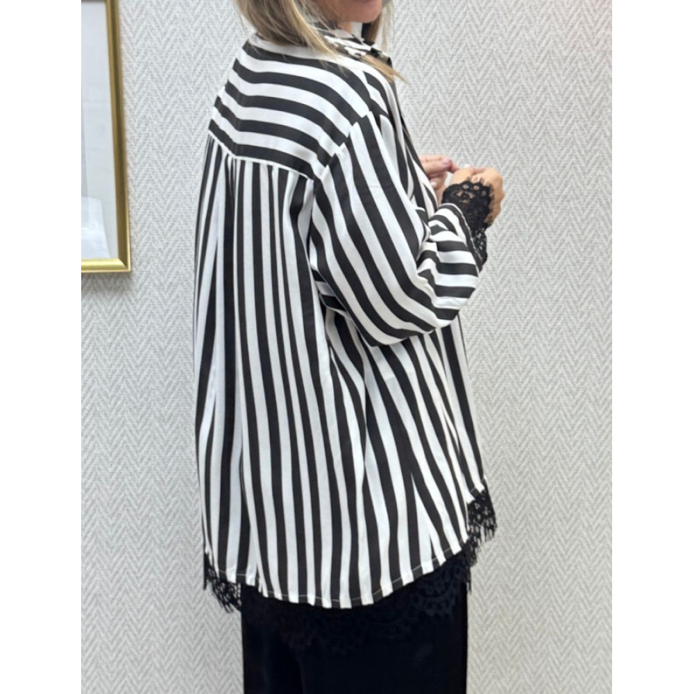 Camisa de corte oversize con estampado de rayas verticales. Presenta cuello clásico, cierre frontal abotonado y manga larga con puños anchos. Los puños y el bajo de la prenda incorporan un ribete de encaje negro. El tejido es liso y con caída.