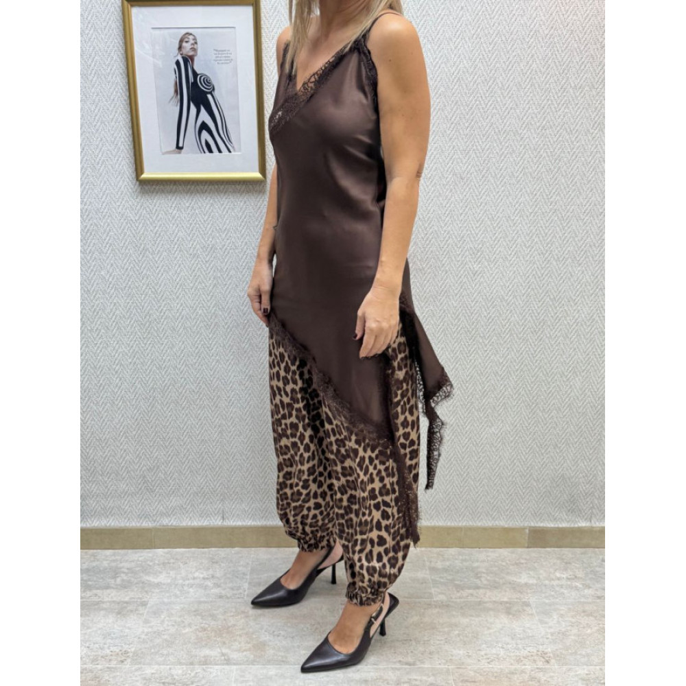 Lencero de tejido satinado con escote de pico y tirantes finos y regulables. Presenta un corte diagonal asimétrico en el bajo y un detalle de encaje en el escote y el bajo.