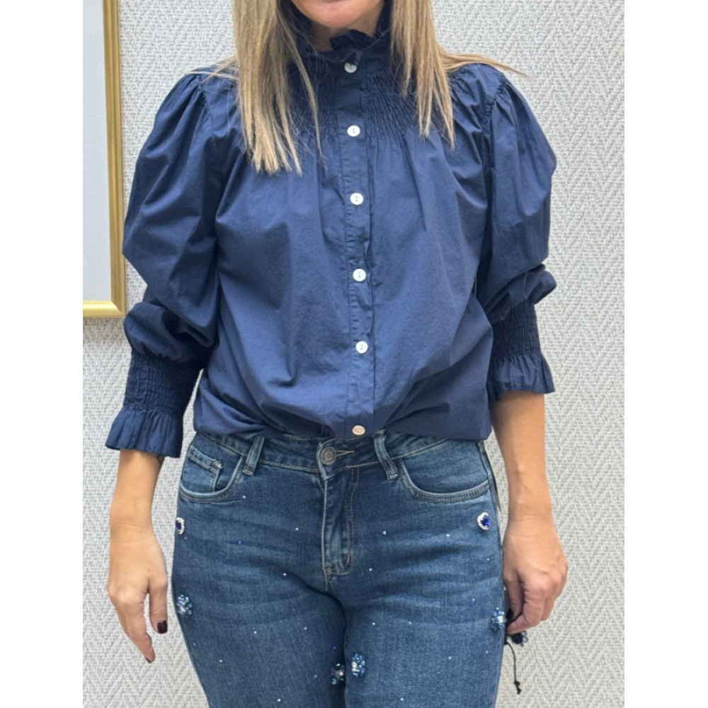 Camisa de tejido liso con cierre frontal abotonado. Presenta un cuello alto con detalle de frunces elásticos y un ligero volante. Las mangas son largas con hombros ligeramente abullonados, terminando en un puño elástico fruncido que crea un efecto de volante en el borde. El cuerpo tiene un corte recto y holgado.