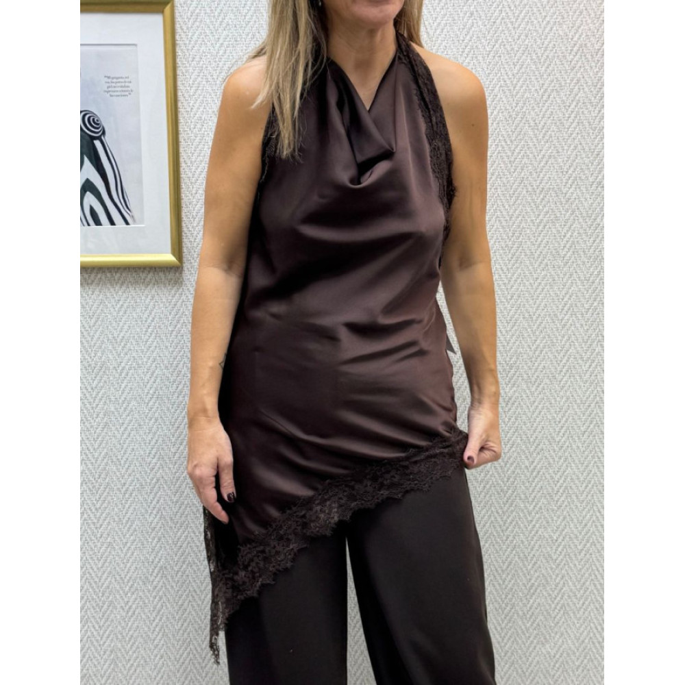 Top lencero de corte holgado y silueta fluida. Presenta cuello halter con escote drapeado sisas amplias y espalda descubierta. La prenda es asimétrica en el bajo e incorpora encaje en los bordes de las sisas y el dobladillo. Confeccionado en tejido satinado.
