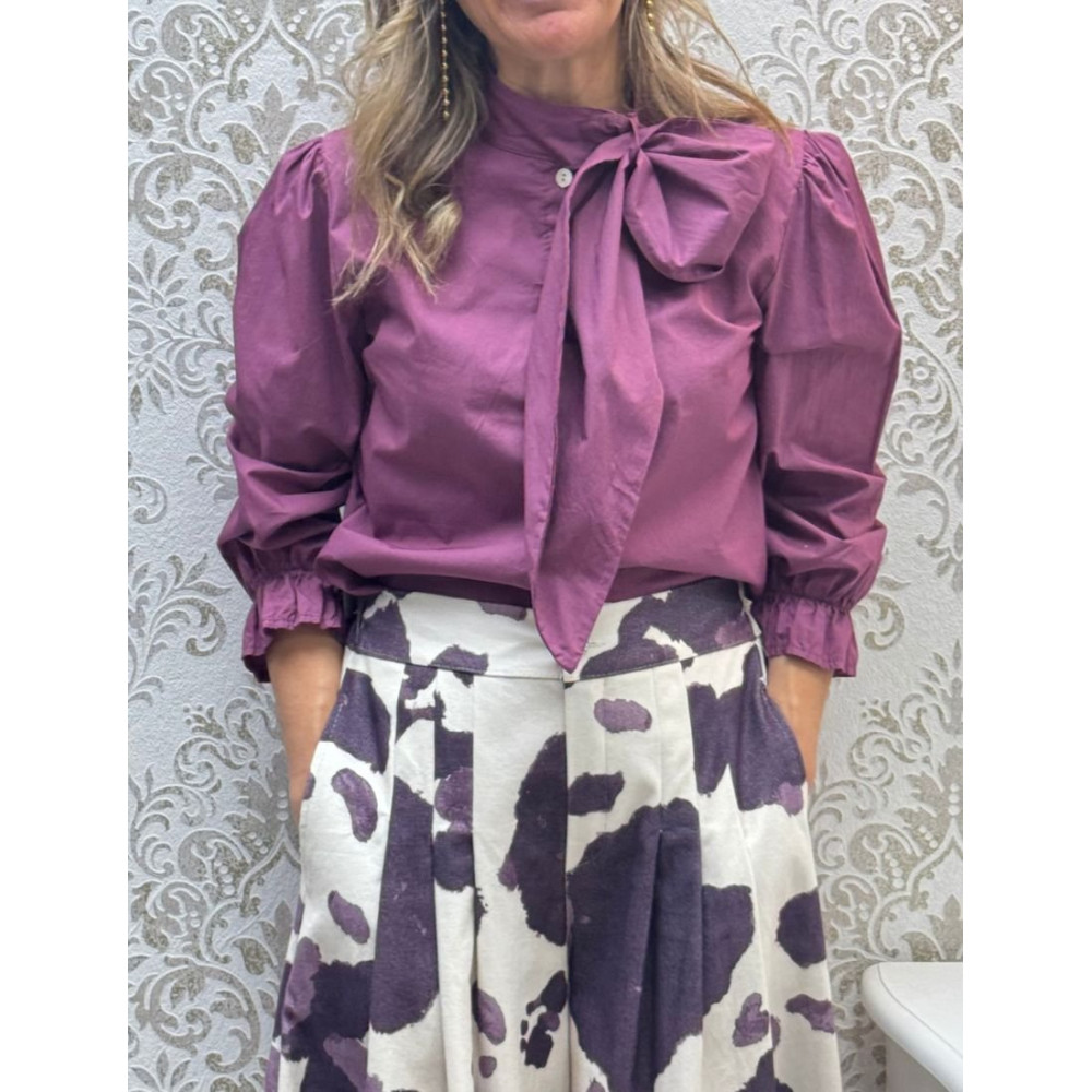 Camisa de manga larga con puño elástico y fruncido. Presenta cierre central frontal abotonado oculto. Caracterizada por un cuello alto y asimétrico con una pieza de tela que se extiende para formar una media lazada en el cuello.