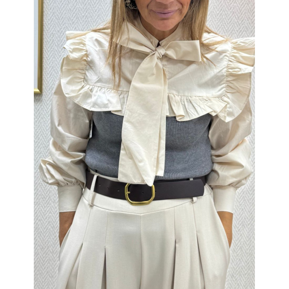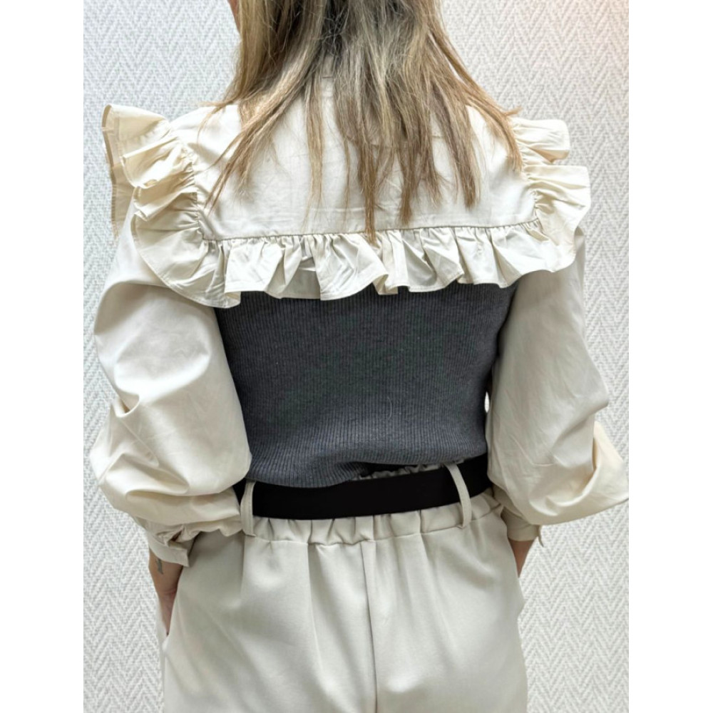 Blusa combinada de corte híbrido. Presenta un cuerpo central de tejido de punto canalé, y el resto confeccionado en tejido de camisa. Cuenta con un cuello alto rematado con una lazada y un volante amplio que cubre los hombros y parte del pecho. La manga es larga y abullonada, ajustada en el puño con cierre de botón.