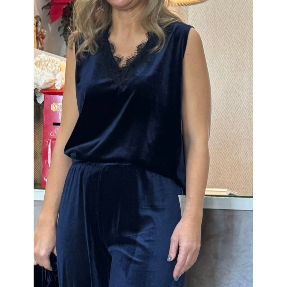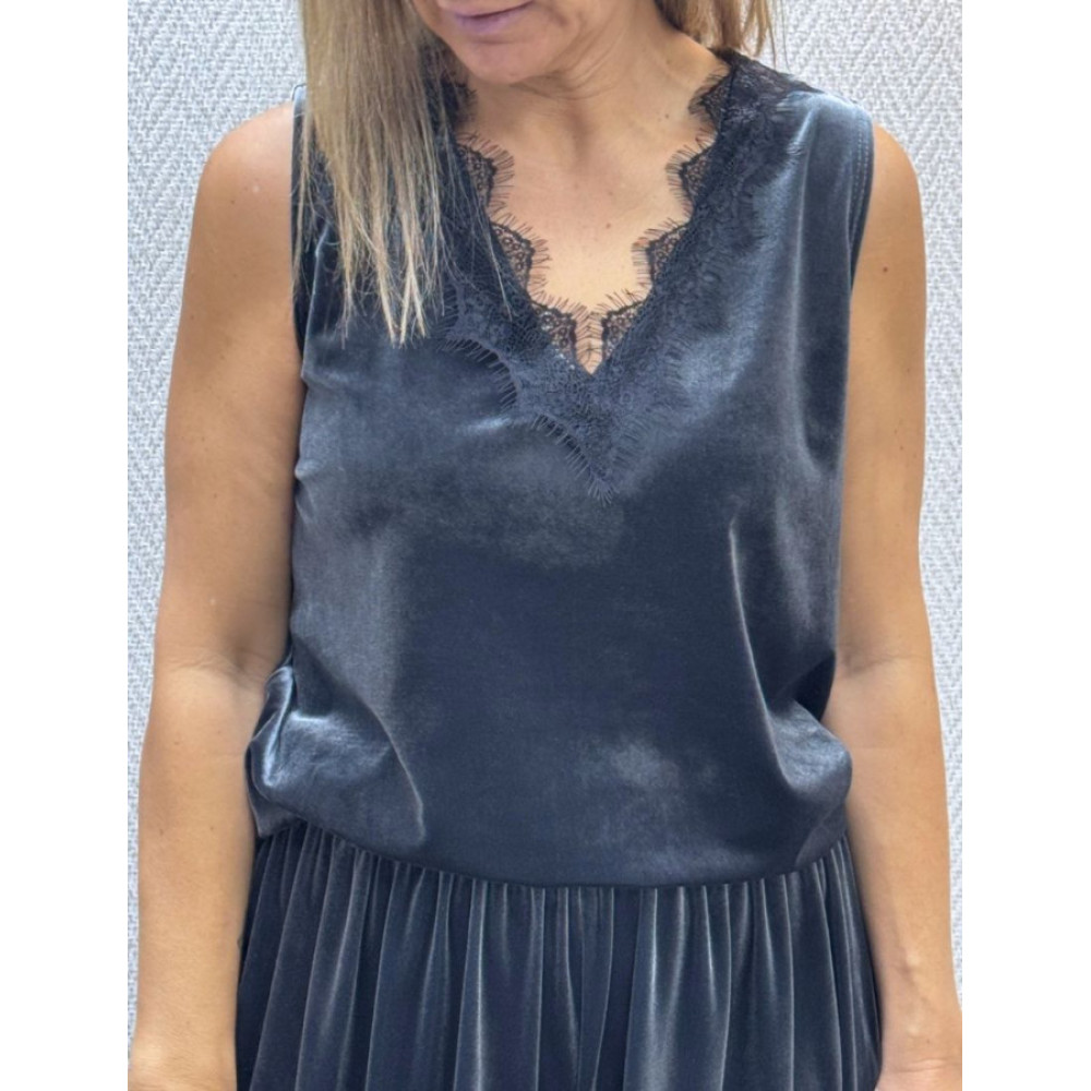 Top de corte lencero y silueta fluida, confeccionado en tejido de terciopelo. Presenta un escote en pico rematado con un ribete de encaje fino a contraste. Diseñado sin mangas, con sisa recta.