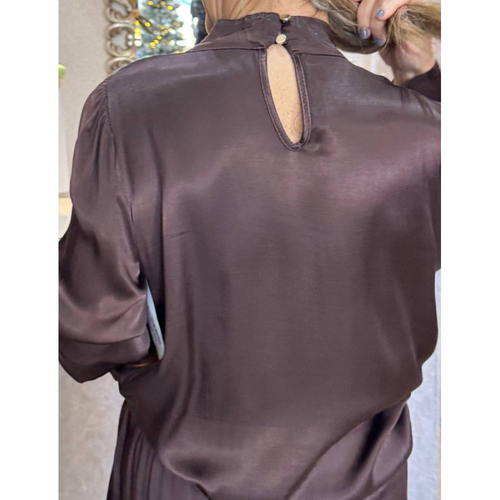 Blusa de corte amplio y holgado, confeccionada en tejido satinado y fluido. Presenta un cuello alto con una abertura en forma de lágrima en la parte frontal central. Las mangas son largas, ligeramente abullonadas en los hombros, y terminan en un puño elástico fruncido a la altura de la muñeca.