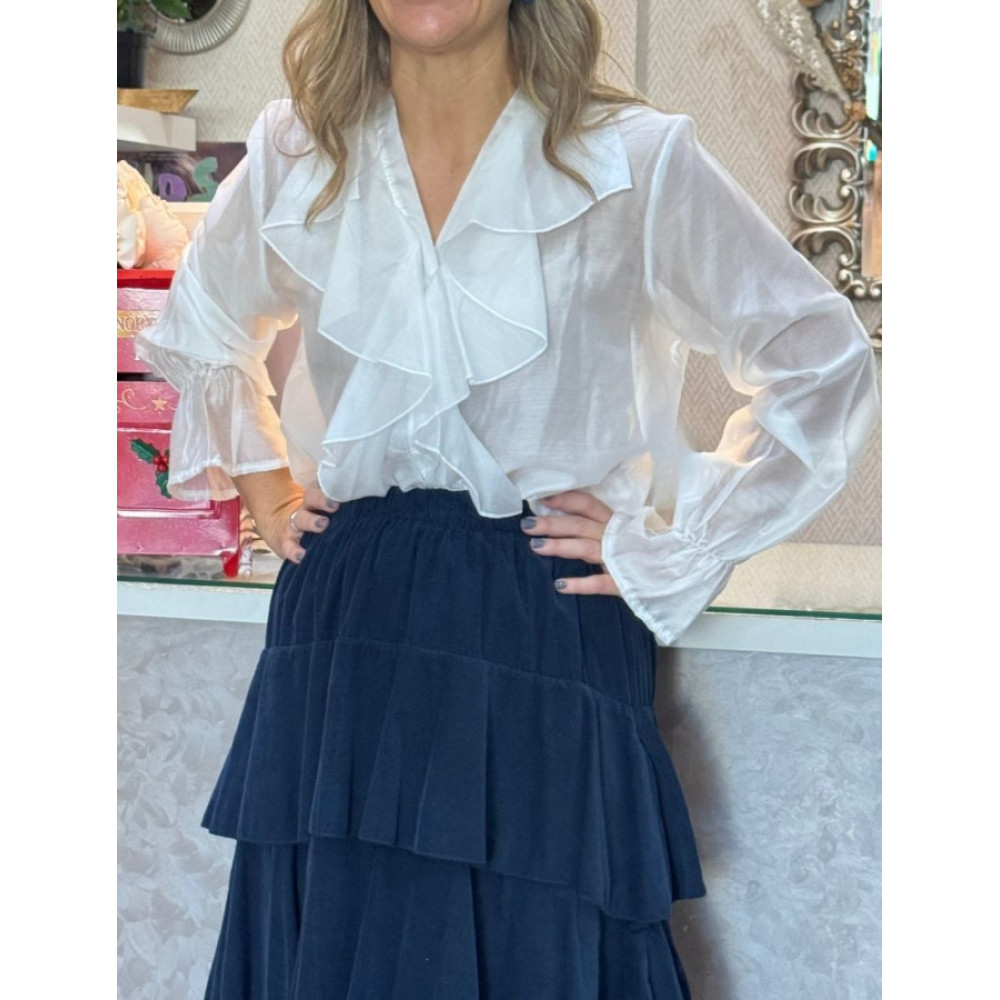 Camisa de corte regular confeccionada en tejido semitransparente. Presenta un cuello de solapa clásico y cierre central abotonado. El diseño se caracteriza por un amplio volante doble que enmarca el cuello y el pecho. Incluye manga larga con un fruncido en el puño que incorpora un elástico.