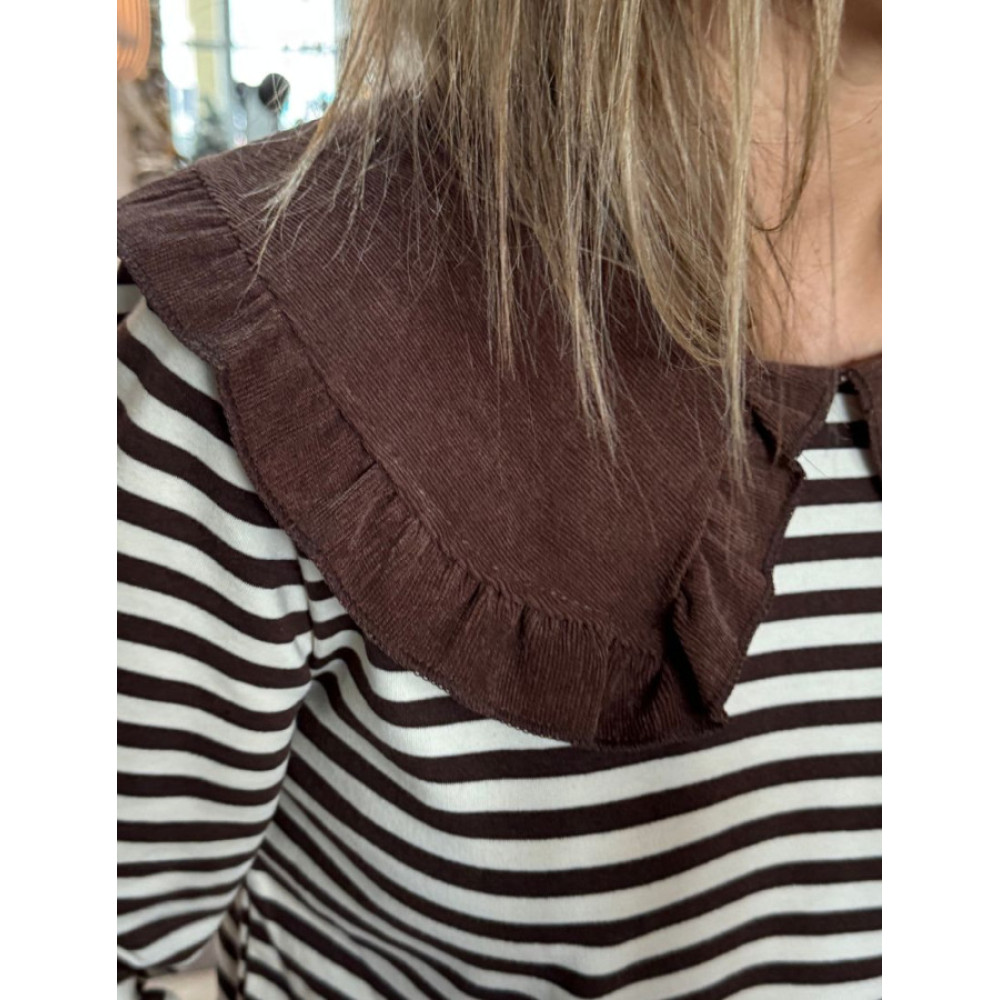 Camiseta de manga larga en tejido de sudadera con patrón de rayas horizontales. Presenta un cuello babero, redondeado, superpuesto, confeccionado en tejido de pana con un borde fruncido. El bajo de la camiseta es ligeramente fruncido y las mangas son de corte regular, terminando en un puño elástico.