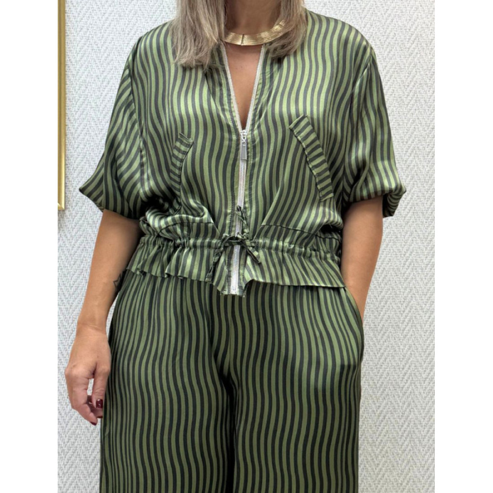Chaqueta tipo bomber. Presenta cierre de cremallera metálica, manga tres cuartos y puños de canalé en tono beige con hilo de lurex dorado. En el bajo cuenta con un cordón ajustable.