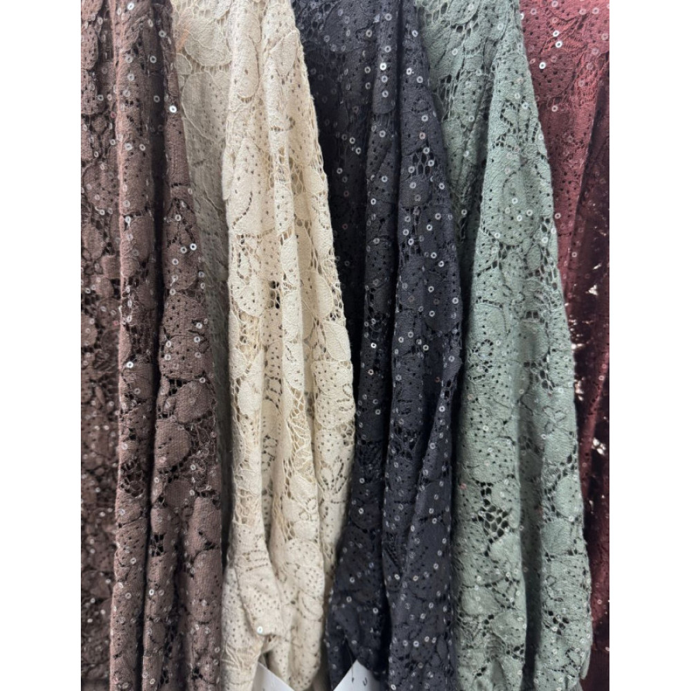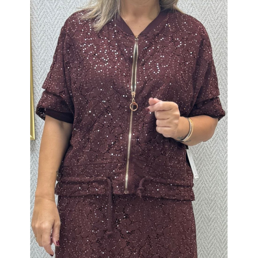 Bomber en tejido de encaje con lentejuelas, . Las mangas son largas. Presenta un cierre de cremallera metálica y elástico con cordón ajustable en la cintura.