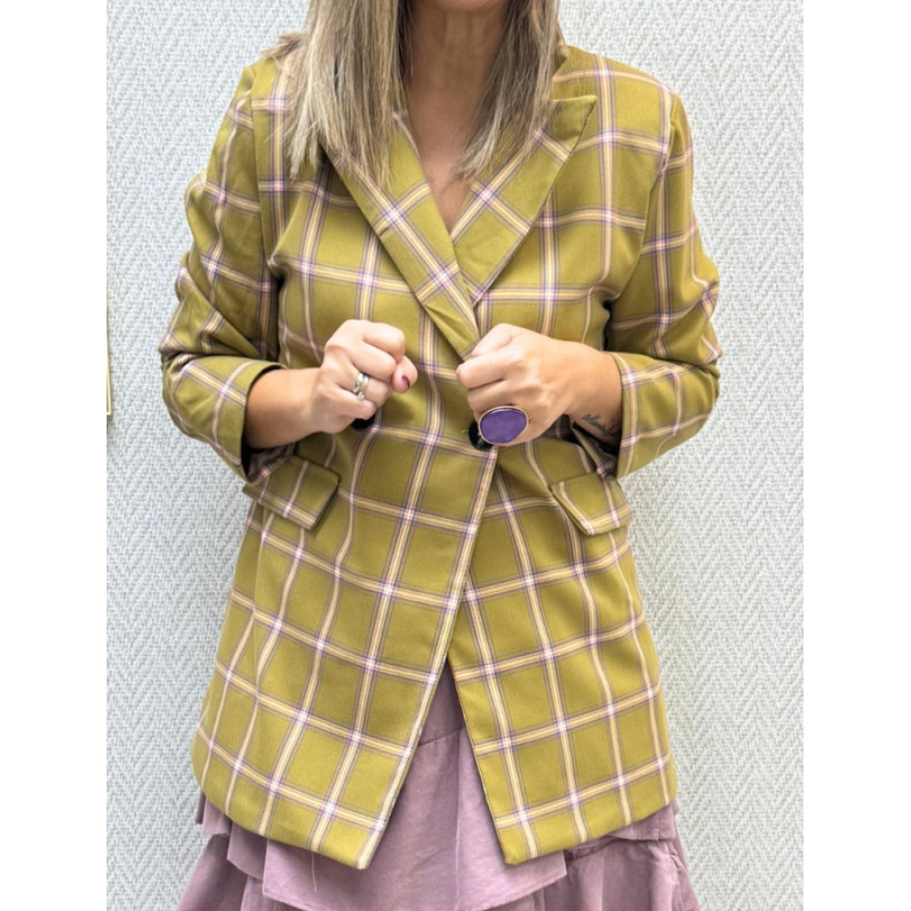 Americana de corte blazer con estampado de cuadros tartán multicolor. Presenta cuello de solapa, cierre cruzado de doble botón y dos bolsillos de tapeta frontales. La chaqueta es de manga larga.