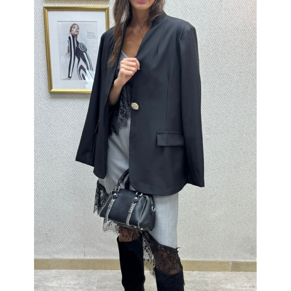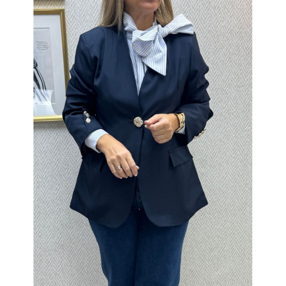 Blazer de corte entallado con cuello solapa y un solo botón de cierre frontal, amplio y texturizado en tono dorado. Presenta dos bolsillos de solapa a nivel de la cadera. Las mangas largas incorporan un detalle de botones decorativos metálicos en el puño.