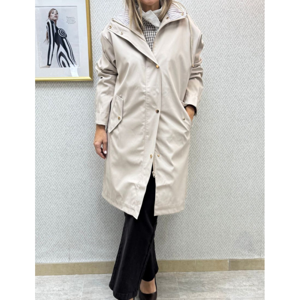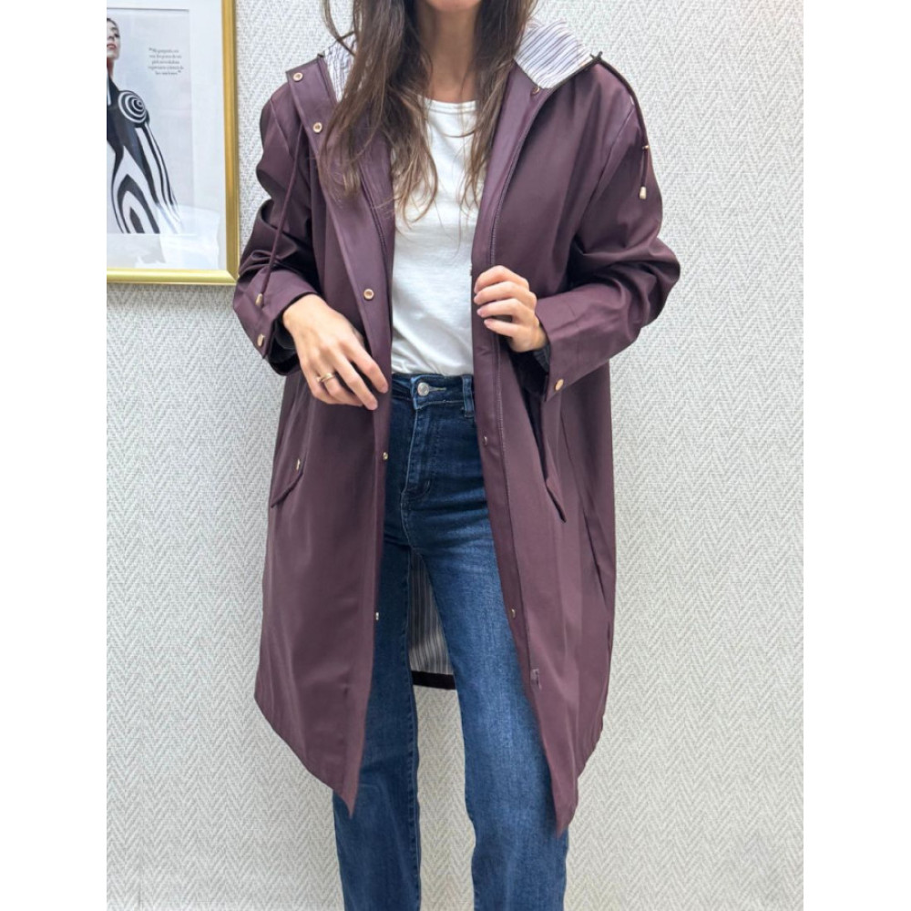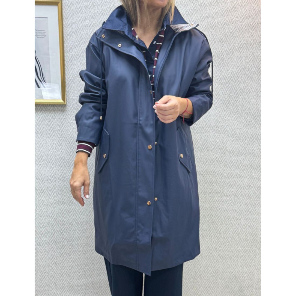 Chubasquero engomado impermeable. Presenta capucha ajustable con cordón y forro interior a rayas. El diseño es de silueta recta y cierre frontal oculto, con detalles de herrajes en tono dorado, incluyendo botones a presión en los puños de las mangas. Incluye bolsillos laterales de solapa.