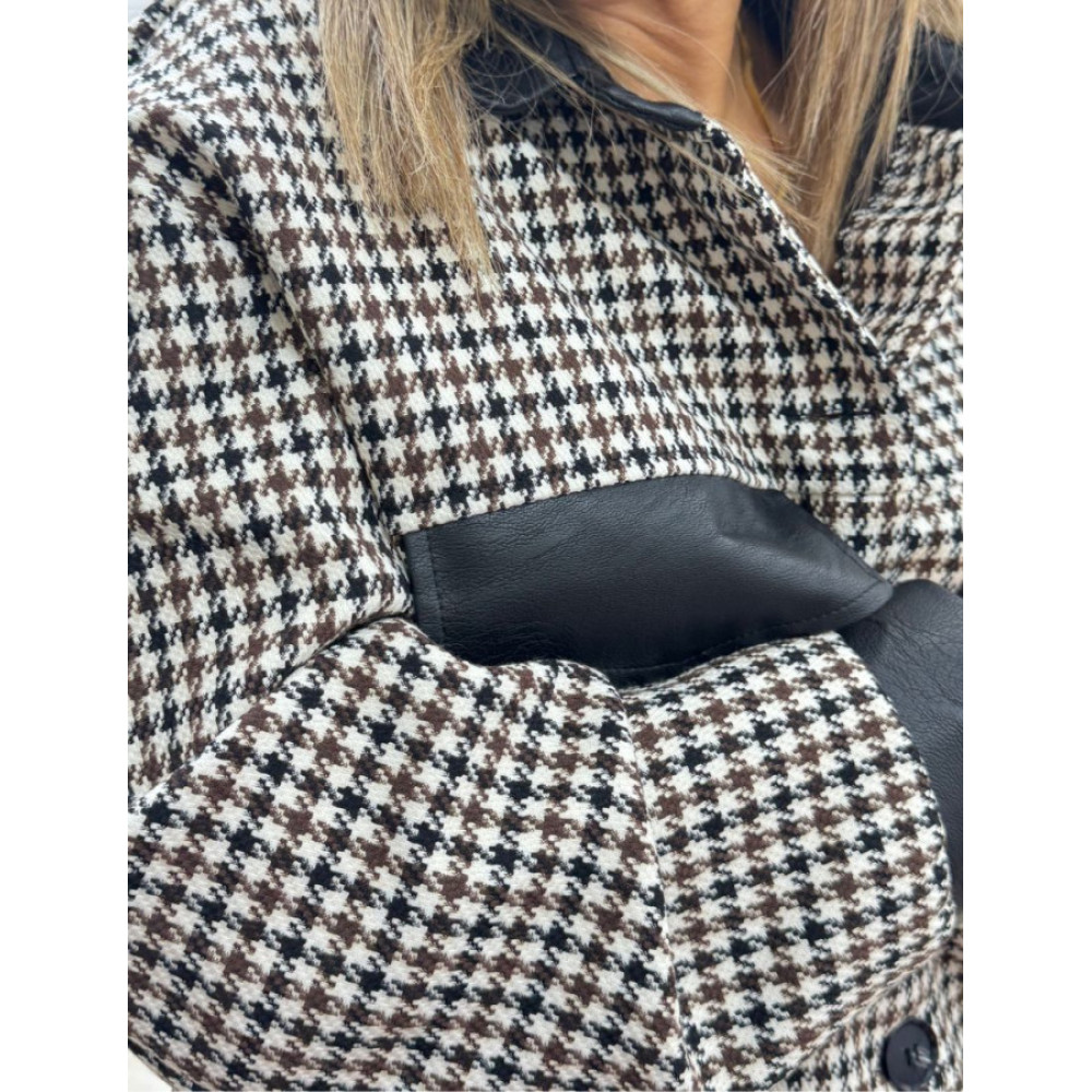 Chaqueta ligera confeccionada en tejido con estampado de pata de gallo en tonos negro, blanco y marrón. Presenta un cuello de camisa tradicional, cierre frontal de botones a contraste, y mangas largas con un ligero efecto abullonado en los hombros. Incluye dos bolsillos de parche en el pecho con solapa de polipiel negra y los puños también están rematados con polipiel negra.