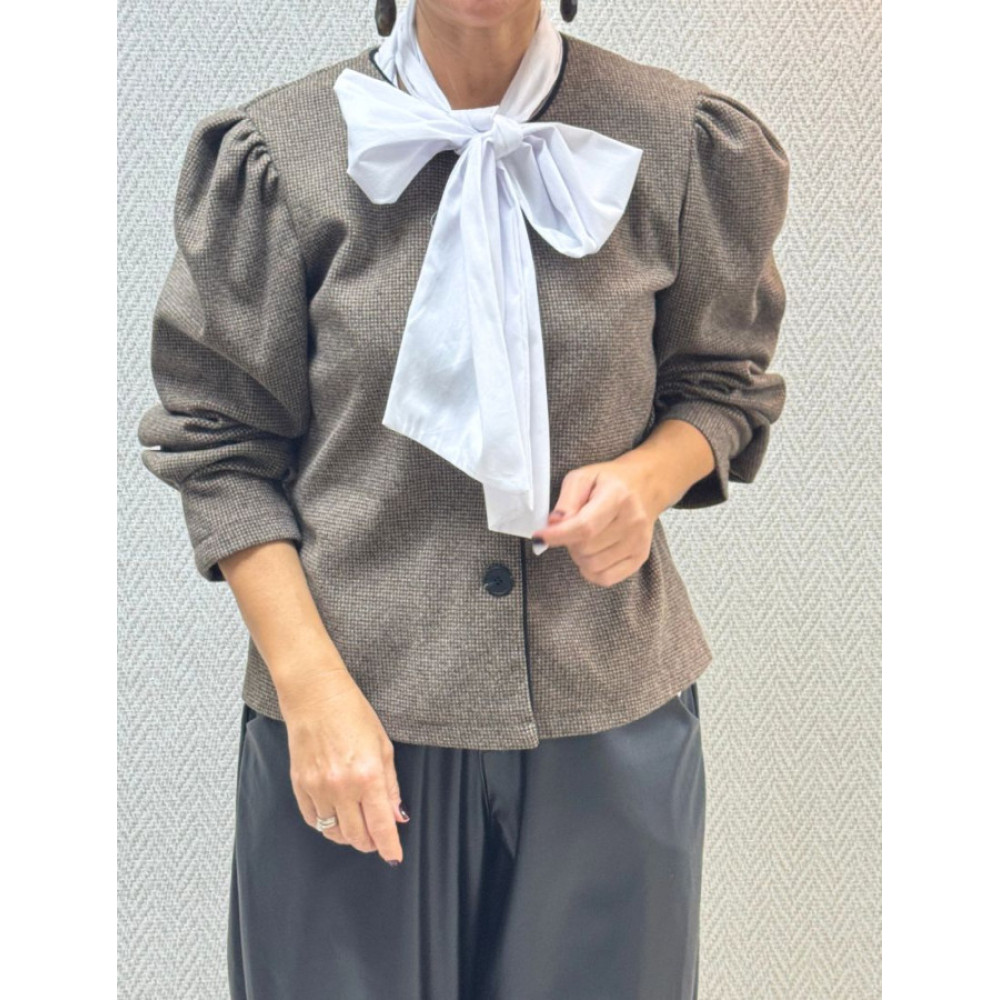 Chaqueta de manga larga abullonada, con cuello redondo ribeteado a contraste y cierre frontal de botones. Confeccionada en estampado pata de gallo.