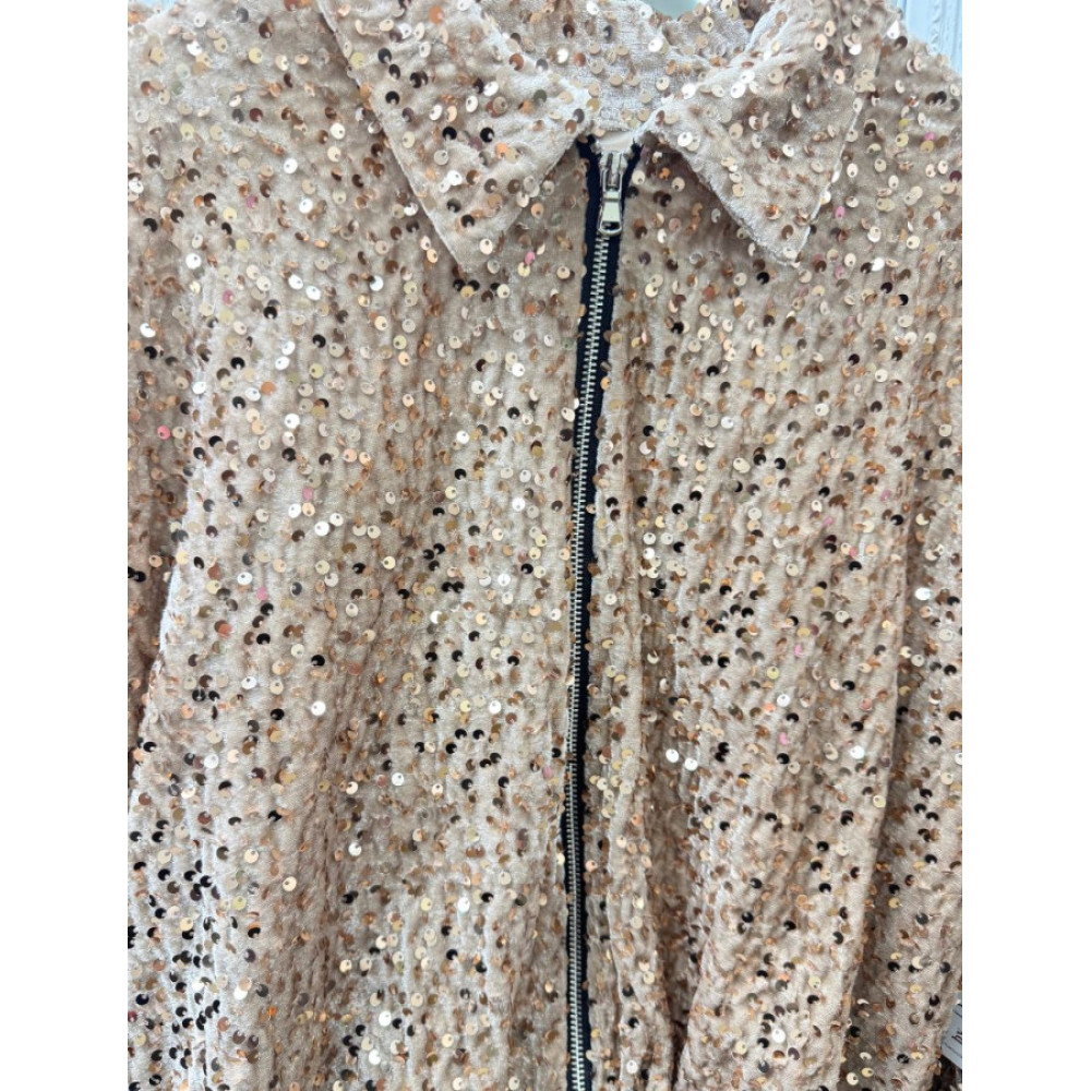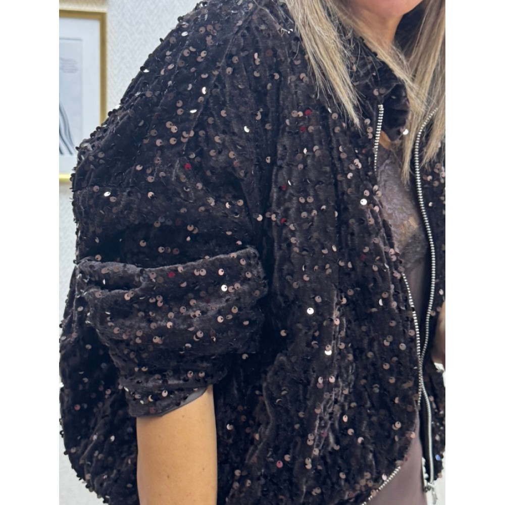 Bomber de corte holgado, con cuello camisero y cierre frontal mediante cremallera metálica. Presenta elástico en el bajo para un efecto abombado. Confeccionada sobre una base de tejido de terciopelo y totalmente recubierta de lentejuelas.