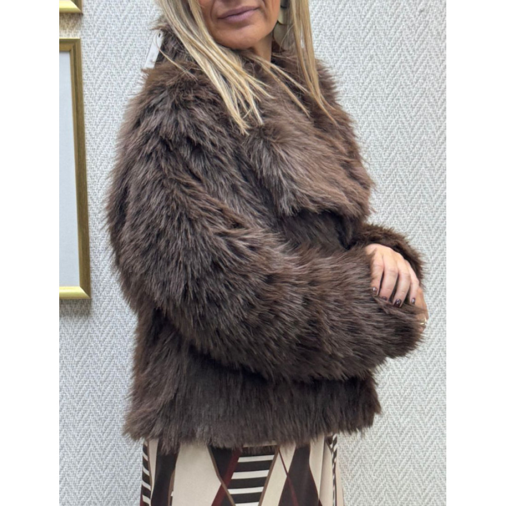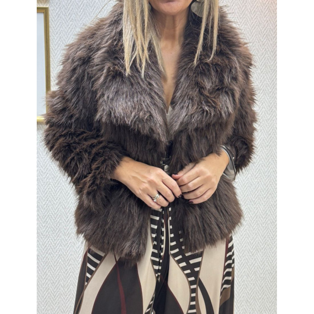 Chaqueta de pelo. Presenta solapas anchas y manga larga. El corte es recto y oversize, con con cierre de clips. El tejido es voluminoso y de pelo largo.