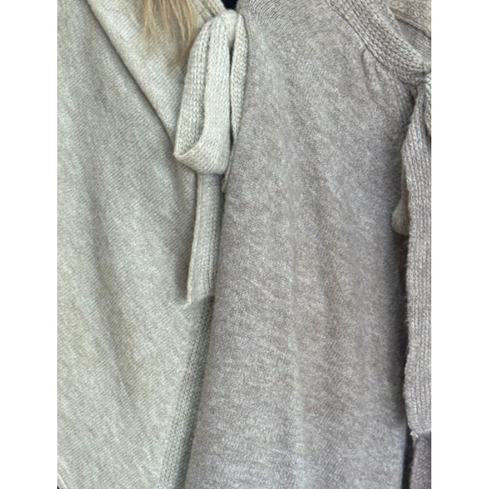 Poncho de punto liso con corte amplio y caída asimétrica se anuda al cuello con una lazada y cierre de botones.