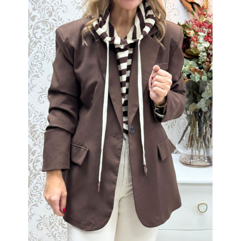 Blazer con aplicación integral de micro-strass distribuidos de manera uniforme. El diseño incorpora solapas de muesca, cierre frontal de un único botón a contraste y bolsillos laterales decorativos con tapeta. Presenta una silueta de corte recto con hombros estructurados y manga larga, manteniendo un acabado texturizado por los detalles brillantes en relieve.