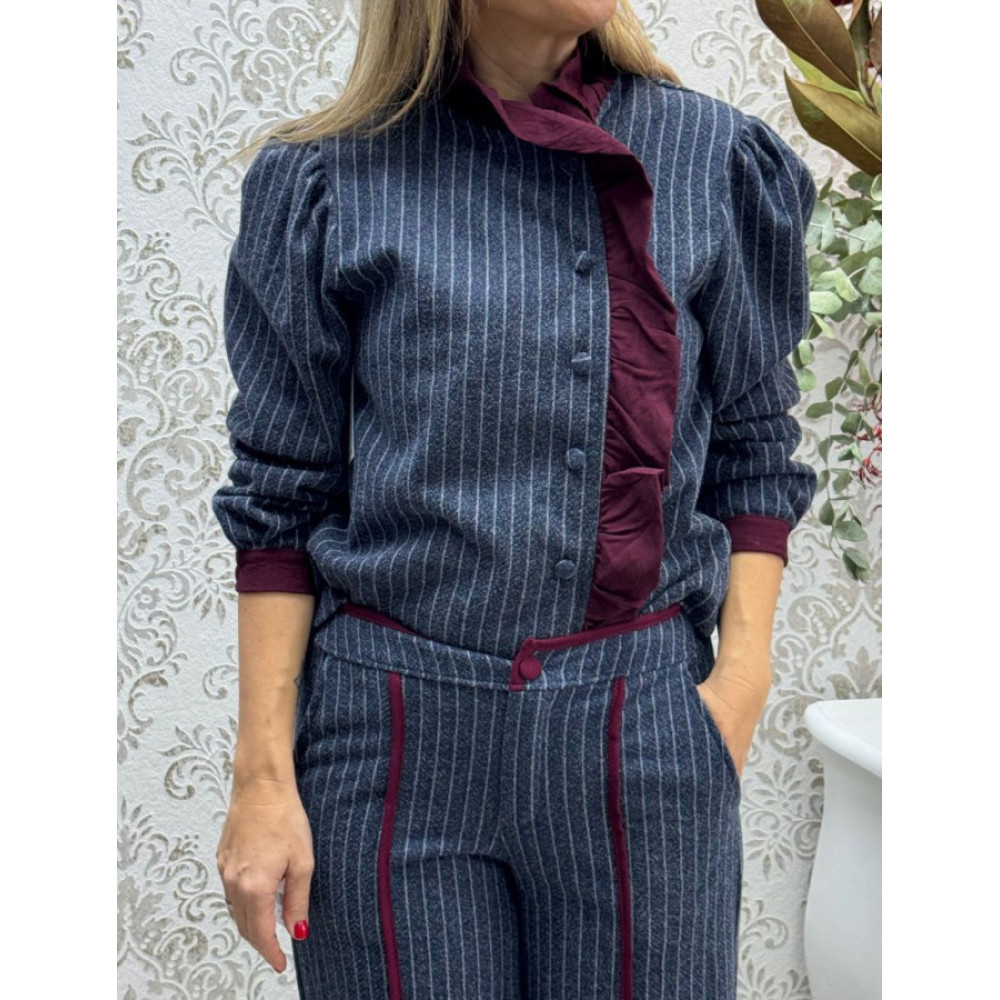 Chaqueta de corte recto con estampado de raya diplomática y hombros fruncidos. Destaca por su cierre frontal de botones forrados y una pechera asimétrica con volantes a contraste que coordinan con los puños anchos.