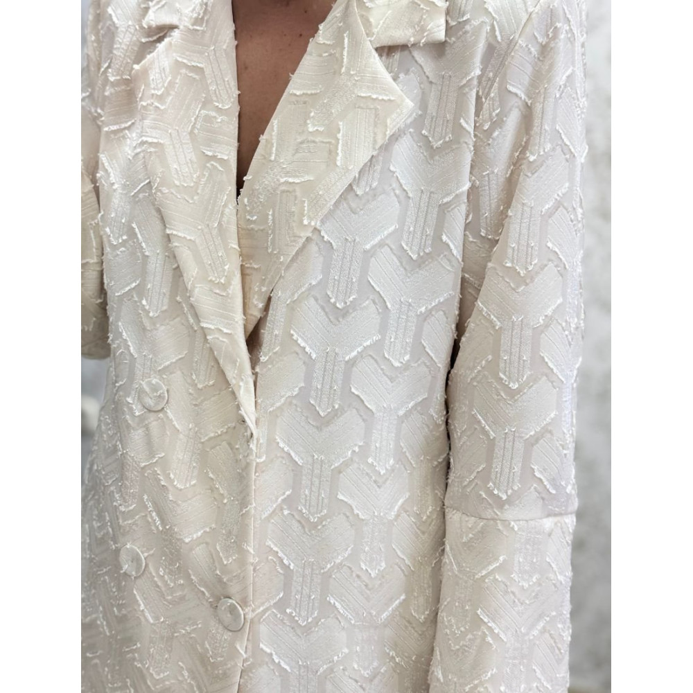 Blazer de manga larga confeccionada en tejido de color beige con textura de relieve geométrico. Presenta un diseño de cuello con solapas de muesca, cierre frontal cruzado mediante doble botonadura a tono. La prenda incluye hombreras para definir la silueta y un bajo de corte recto con acabado de costuras invisibles.