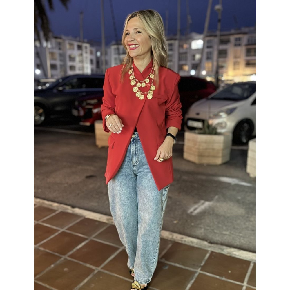 Blazer sastre de color rojo con cierre asimétrico de un solo botón lateral en el cuello. Presenta manga larga, hombreras integradas y dos bolsillos delanteros decorativos con solapa en la cadera, además de un bolsillo de vivo decorativo en el pecho. La prenda está confeccionada en un tejido fluido con caída y tiene un largo por debajo de la cadera con bajos rectos.