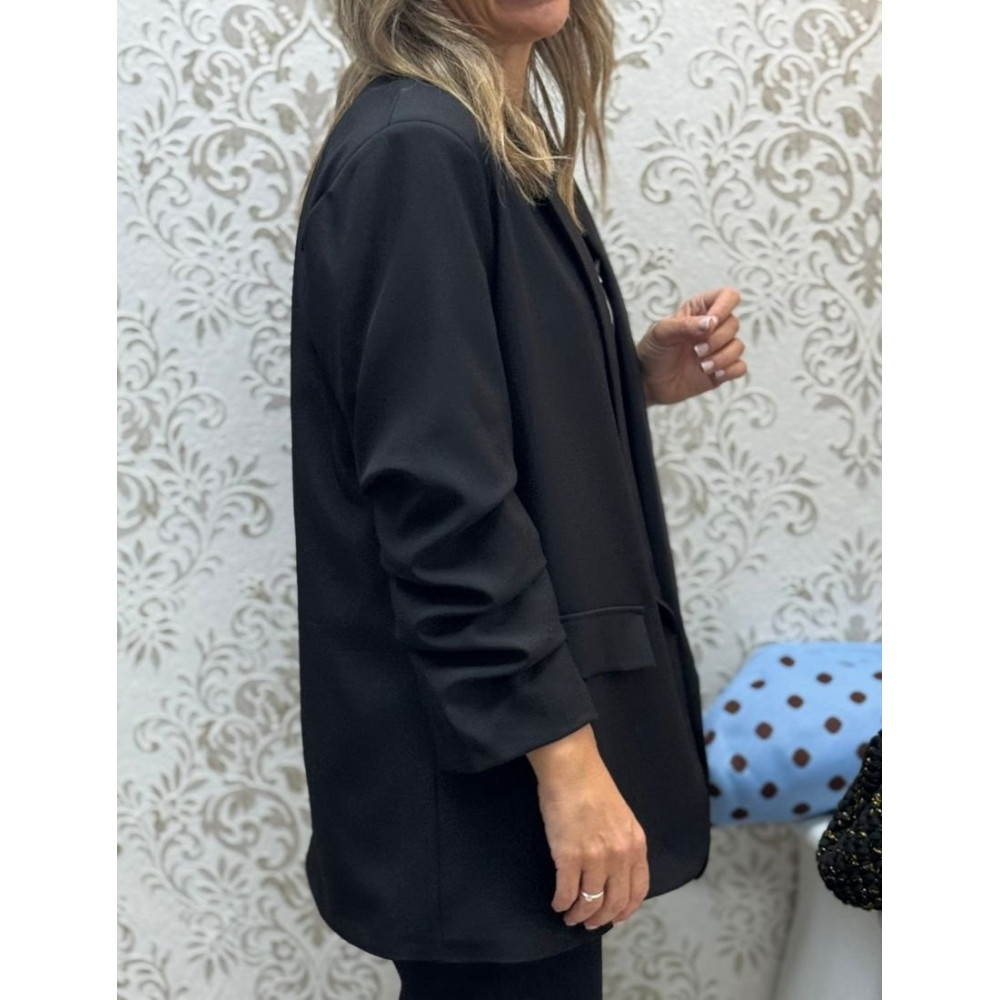 Blazer de corte recto. Presenta cuello de solapa tipo chal de caída fluida y diseño frontal abierto sin botones. Destaca por sus mangas de largo tres cuartos con detalle fruncido permanente que crea un efecto recogido. Incluye dos bolsillos laterales decorativos con tapeta en la parte frontal y hombros estructurados.