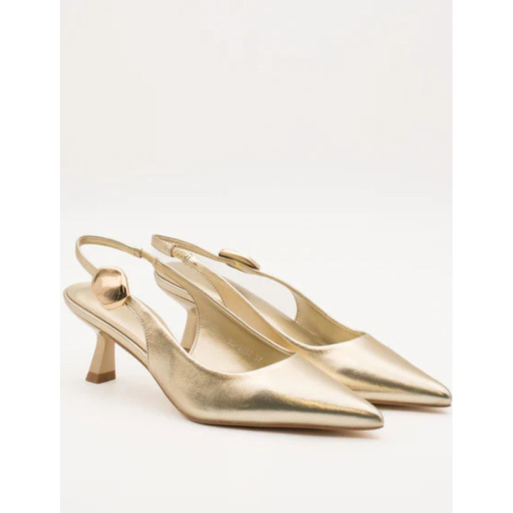 Zapato slingback con acabado dorado metalizado y puntera afilada. El modelo incorpora un adorno circular metálico sobredimensionado en la tira del talón, que es ajustable mediante un pequeño inserto elástico. El tacón es kitten heel de diseño bicolor.