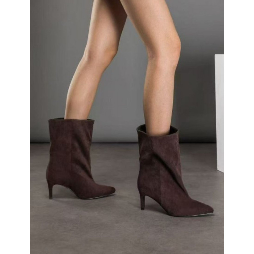 Botín de caña media con efecto arrugado y punta afilada. Presenta un tacón de aguja fino y altura media. El corte de la caña es ancho y liso. Están confeccionados en ante.