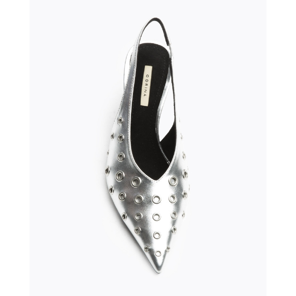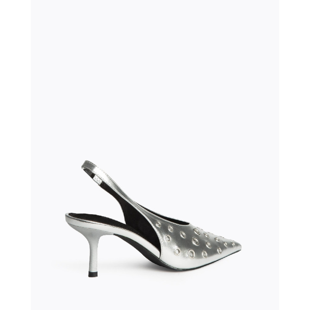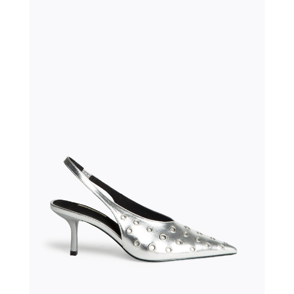 Salón de tacón fino y diseño destalonado, con elástico lateral interior para un mejor ajuste. Presenta una punta afilada y empeine en pico que estilizan el pie. Decorado con ojales de diferentes tamaños en plata.