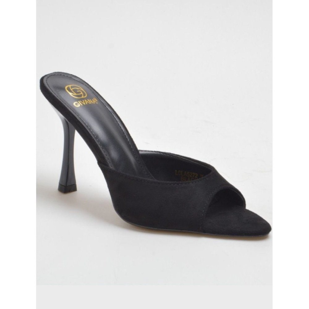Mule de tacón alto confeccionado en antelina de color negro, con diseño de punta abierta. Presenta un tacón fino de 10 cm, estructura descubierta en el talón y acabado elegante ideal para ocasiones formales o de noche.