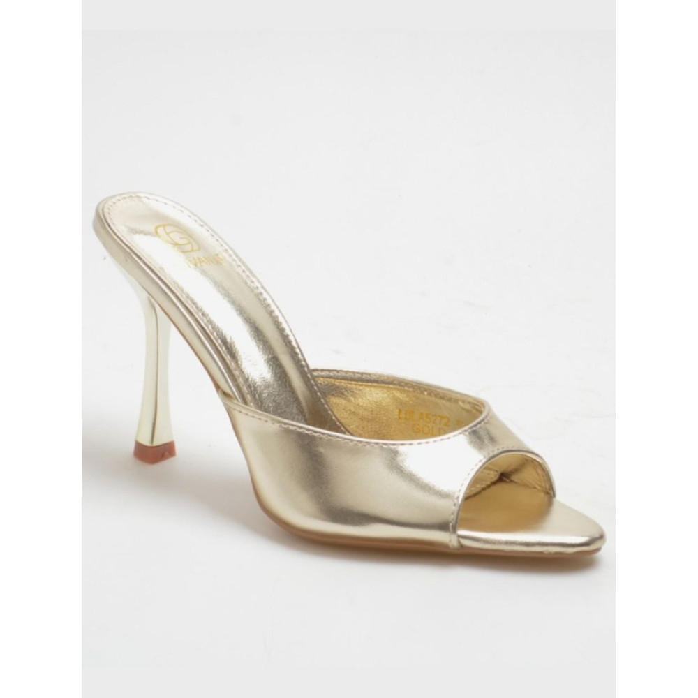 Mule de tacón alto metalizado en color dorado, con diseño de punta abierta. Presenta un tacón fino de 10 cm, estructura descubierta en el talón y acabado elegante ideal para ocasiones formales o de noche.