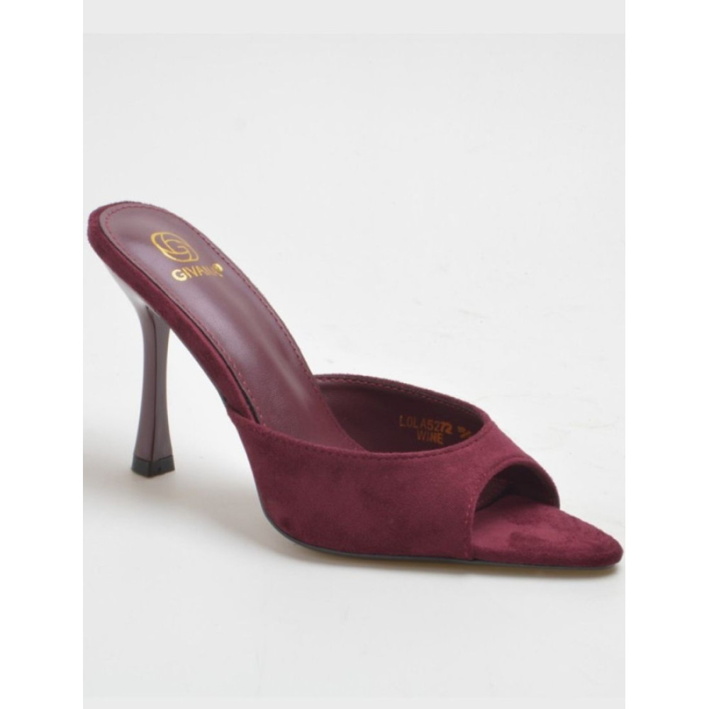 Mule de tacón alto confeccionado en antelina de color burdeos, con diseño de punta abierta. Presenta un tacón fino de 10 cm, estructura descubierta en el talón y acabado elegante ideal para ocasiones formales o de noche.