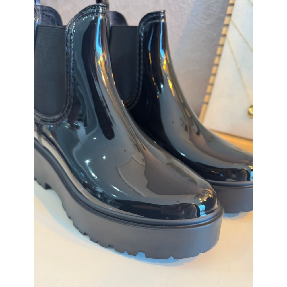 Botín de agua tipo confeccionado en material sintético con acabado de alto brillo. Presenta paneles laterales elásticos y un tirador posterior para facilitar el calce. La estructura integra una puntera redondeada y se asienta sobre una suela de plataforma con relieve tipo track de acabado mate.