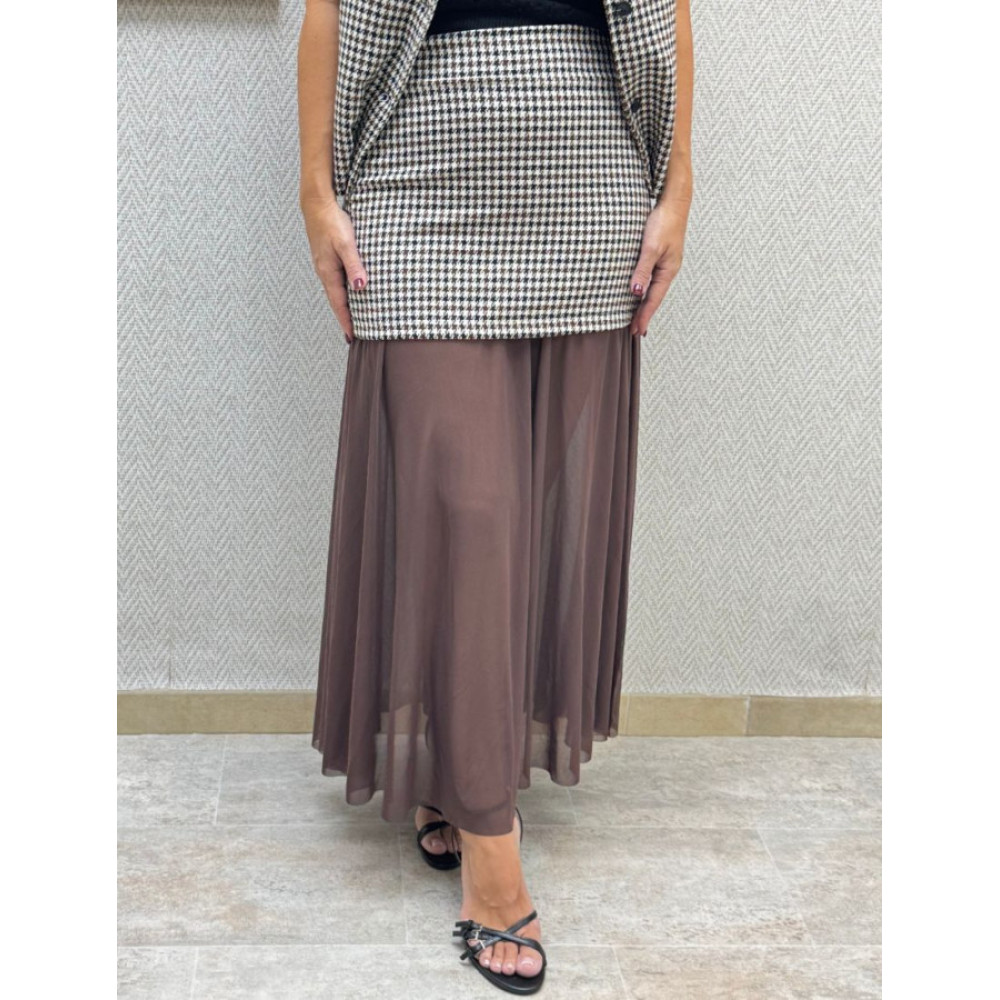 Falda de diseño híbrido con cinturilla alta. La parte superior es una minifalda recta confeccionada en tejido de pata de gallo en blanco y marrón. La parte inferior, que se extiende hasta el tobillo, está compuesta por una capa de gasa semitransparente de color marrón liso, que le otorga un efecto de sobrefalda fluida y vaporosa. Se cierra mediante cremallera oculta en la parte trasera.