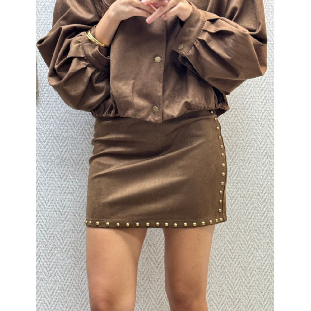Falda corta y ajustada de corte recto en color marrón. Presenta un detalle de tachuelas metálicas redondas a lo largo de las costuras laterales y el bajo. La cintura es lisa. El tejido es liso, con acabado de ante.