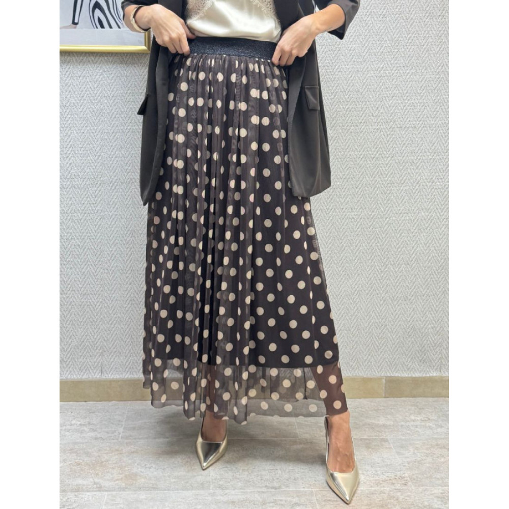 Falda midi plisada de tejido de tul con estampado de lunares. Presenta una cintura elástica y un ligero vuelo. El bajo tiene un acabado limpio. El tejido exterior es semitransparente.