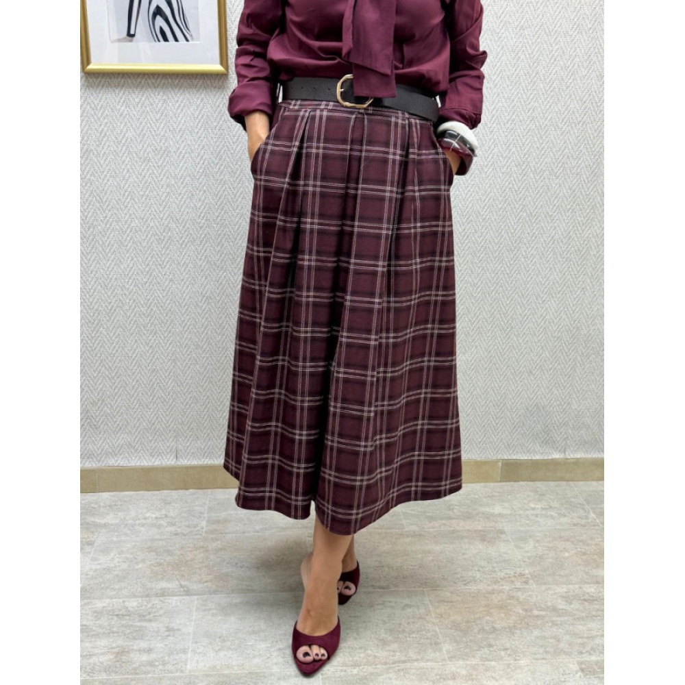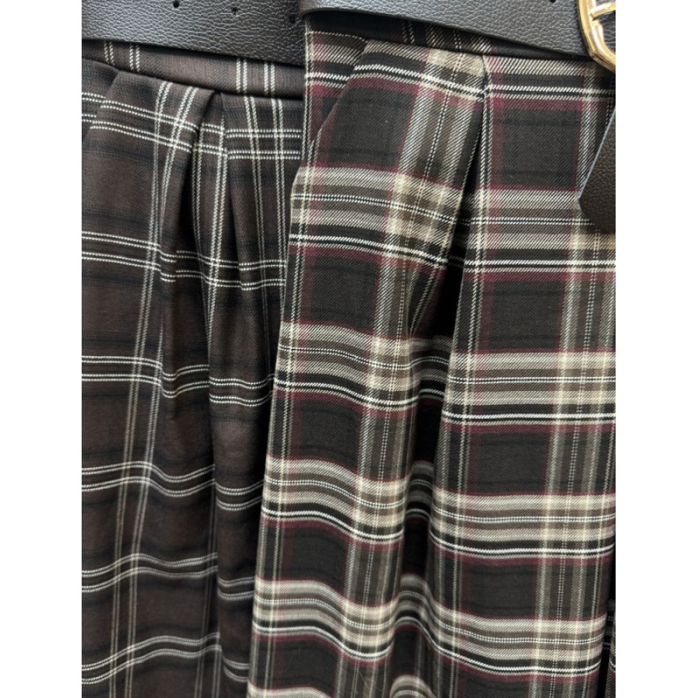Falda midi de corte A con estampado de cuadros escoceses. Presenta cintura alta con pliegues en la parte frontal y bolsillos laterales. El tejido es grueso. El cinturón de piel con hebilla metálica está incluido.