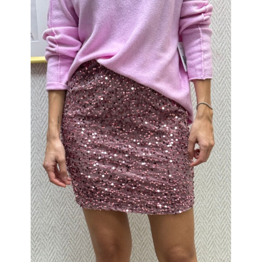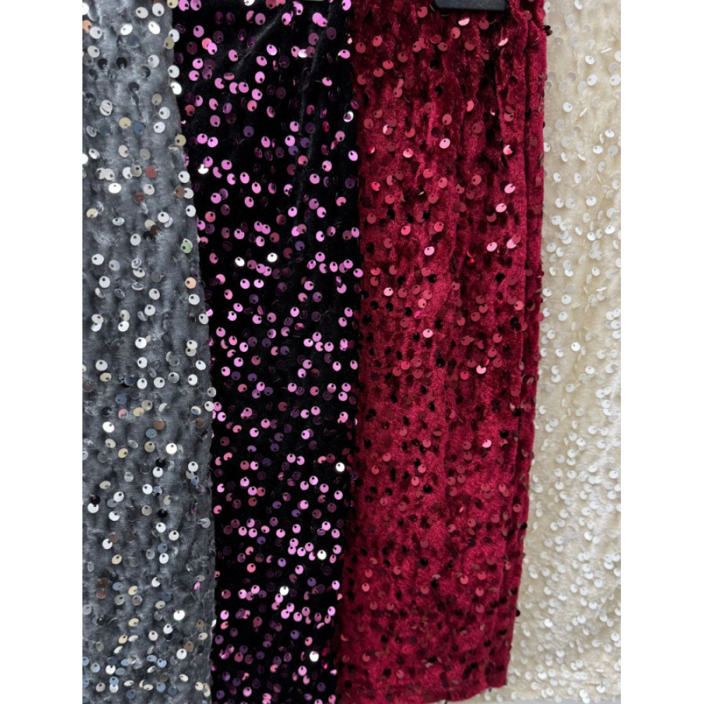 Minifalda de corte recto confeccionada en tejido de terciopelo con una cobertura total de lentejuelas redondas y pequeñas. La prenda presenta un acabado brillante y un ajuste ceñido.