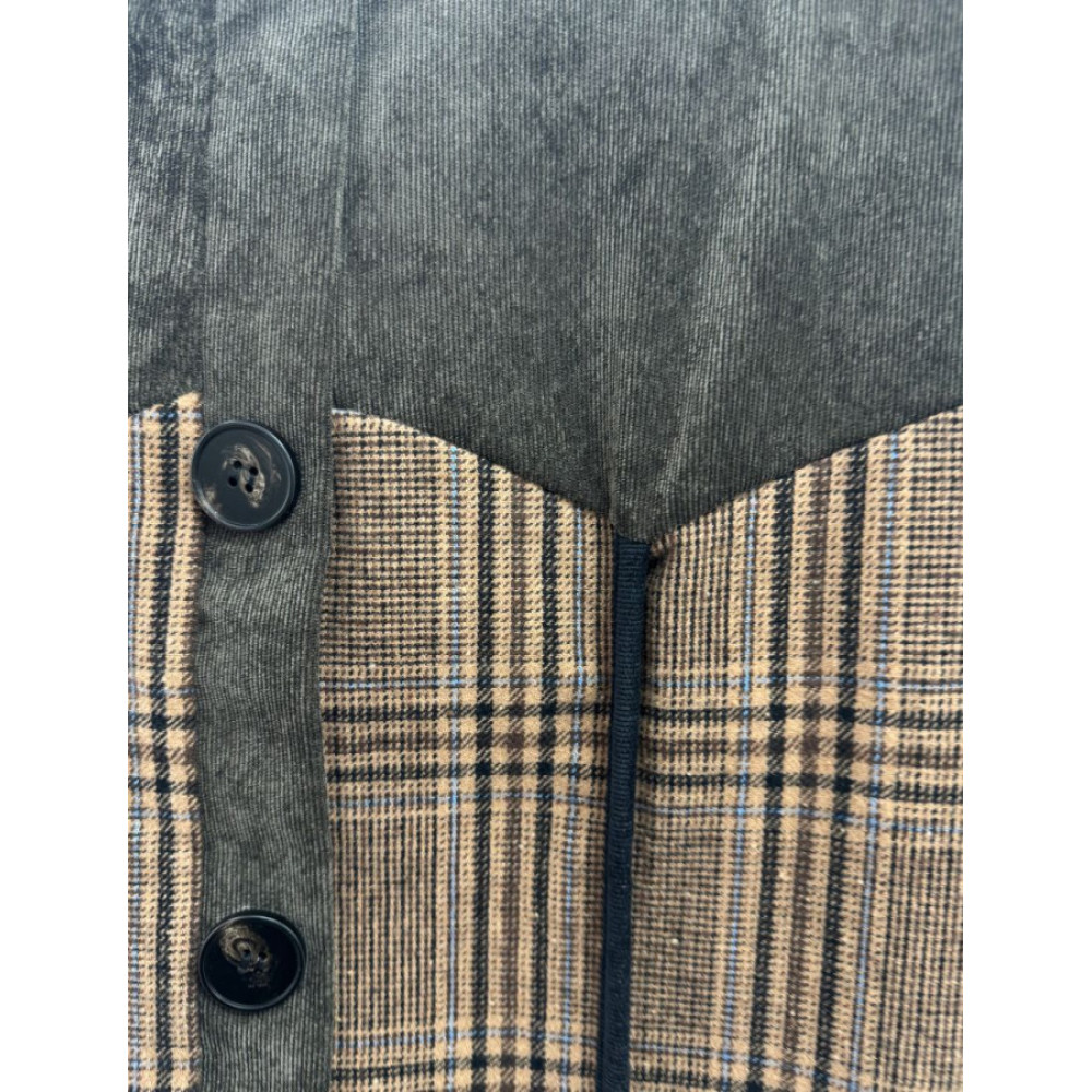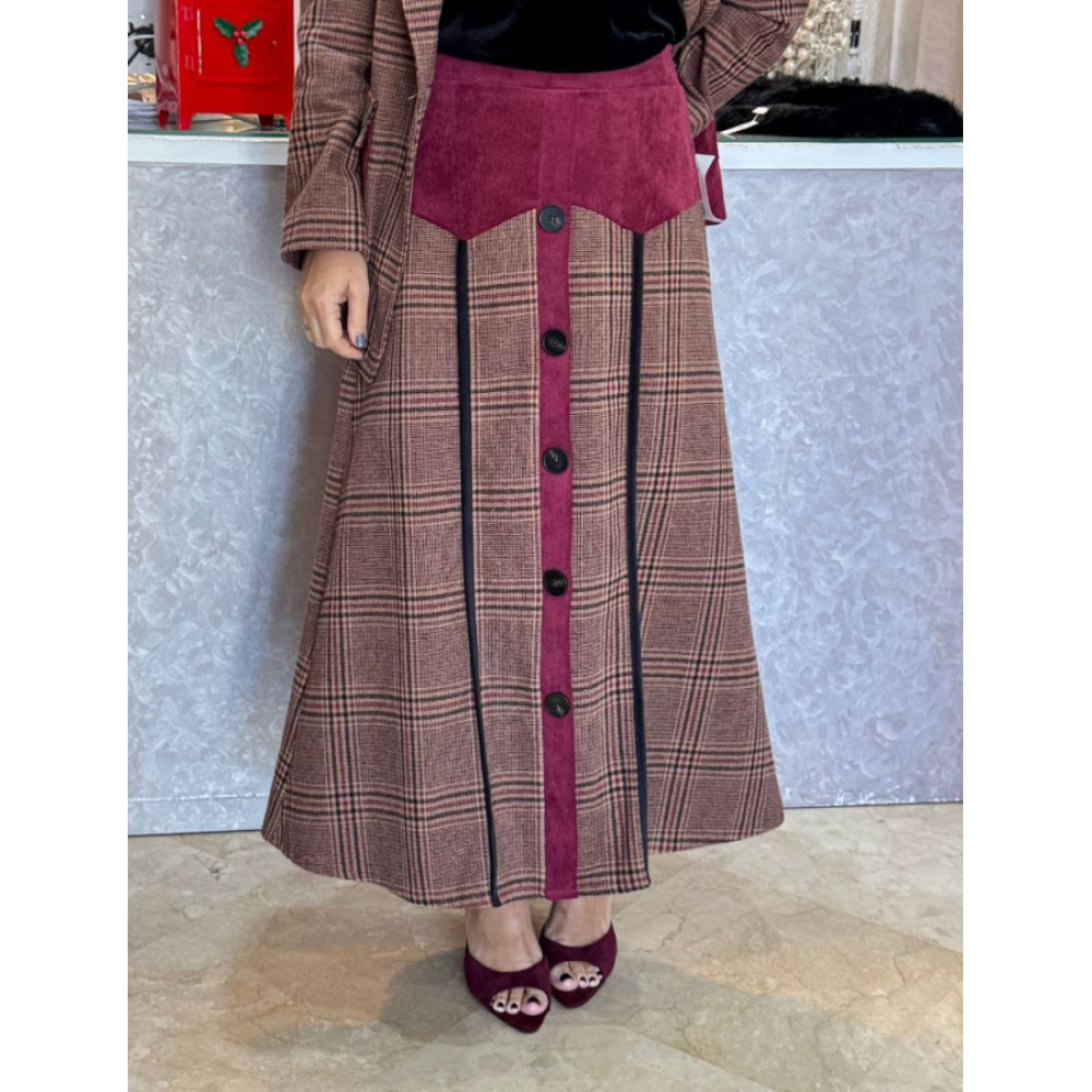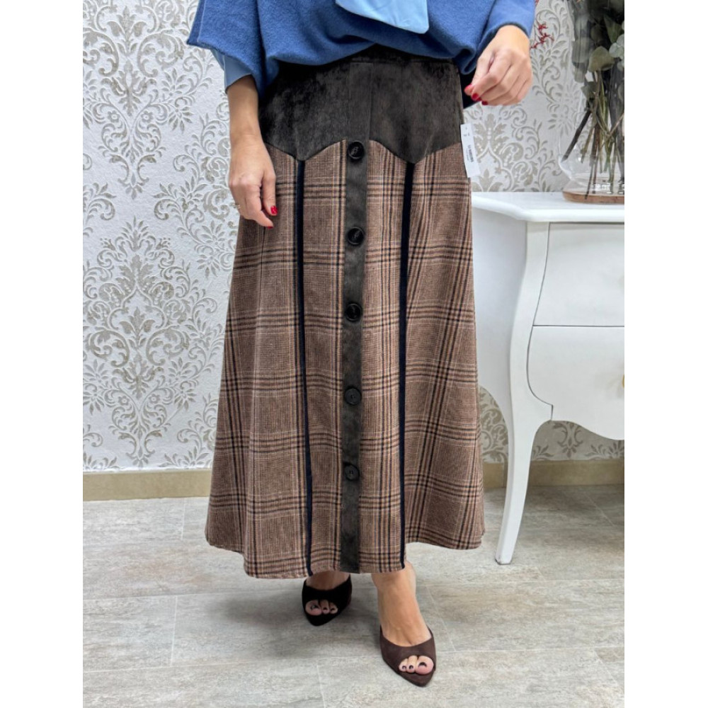 Falda de paño de corte recto con panel central vertical y canesú frontal superior en tejido de pana. Incorpora una botonadura decorativa central y líneas de costura verticales que aportan estructura.