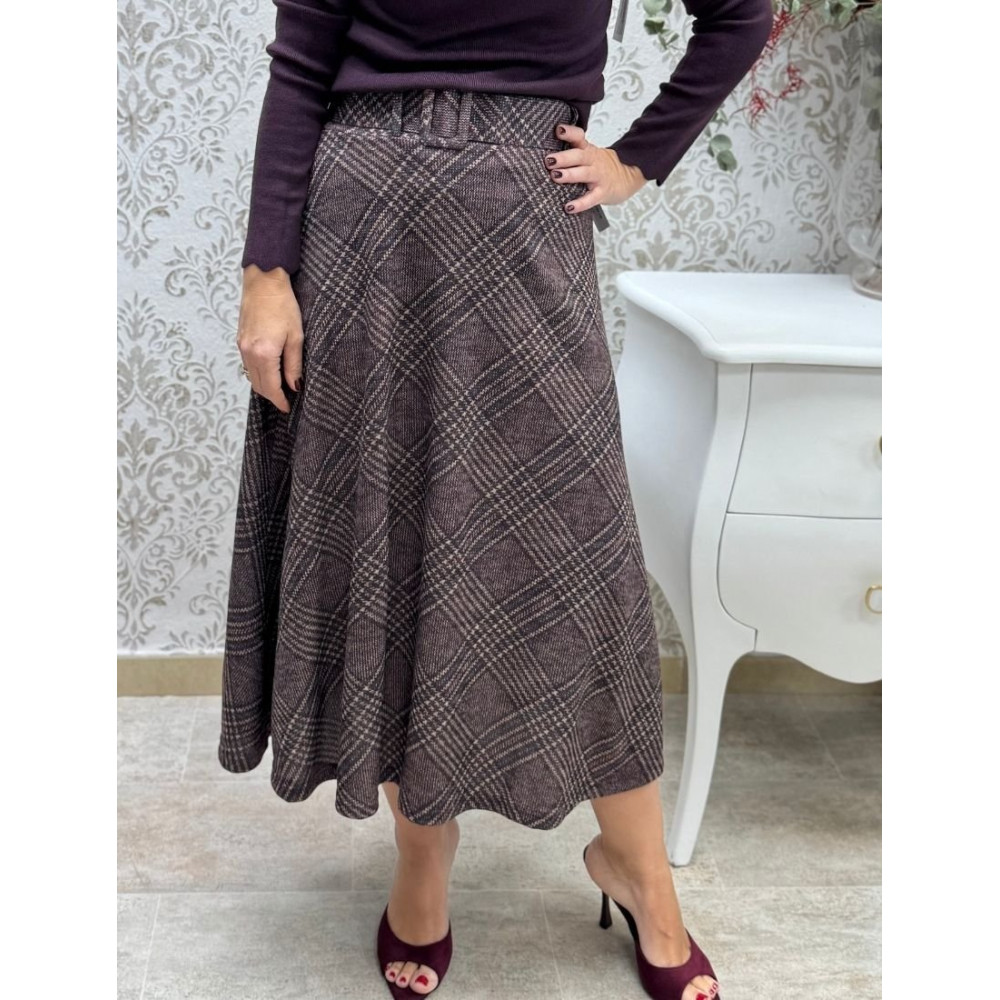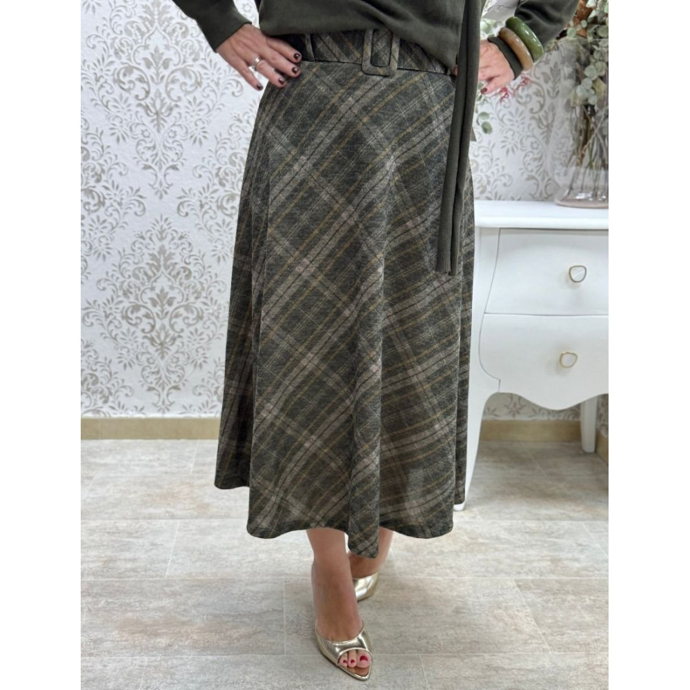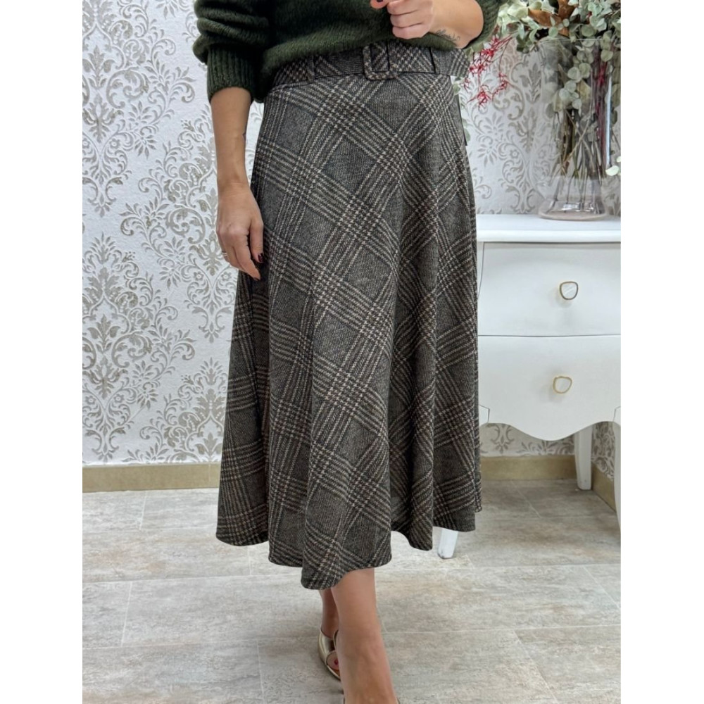 Falda de corte evasé y longitud midi. La prenda cuenta con una cintura alta estructurada que incorpora trabillas y un cinturón a juego con hebilla forrada en el mismo material. Presenta un diseño de vuelo natural con caída fluida, costuras laterales invisibles y un bajo con acabado de dobladillo sencillo, proporcionando una silueta en línea A de inspiración clásica.