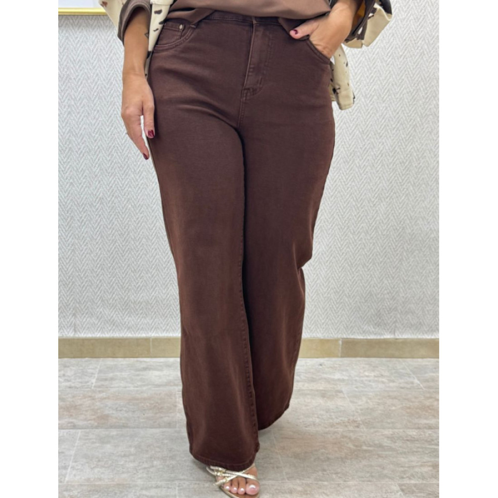 Pantalón vaquero de color marrón oscuro. Presenta cintura de tiro alto y corte recto. Cuenta con un diseño de cuatro bolsillos y cierre de botón con cremallera.