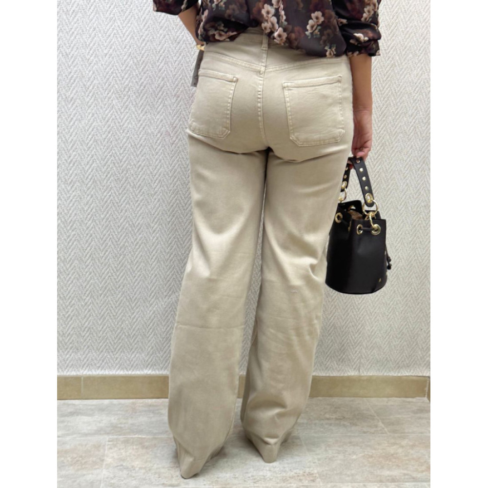 Pantalón vaquero de corte recto con tiro alto en color beige tostado. Presenta cintura con trabillas, cierre frontal de botón y cremallera, y bolsillos delanteros y traseros. El bajo está rematado con un dobladillo ancho visible. Es de tejido denim.