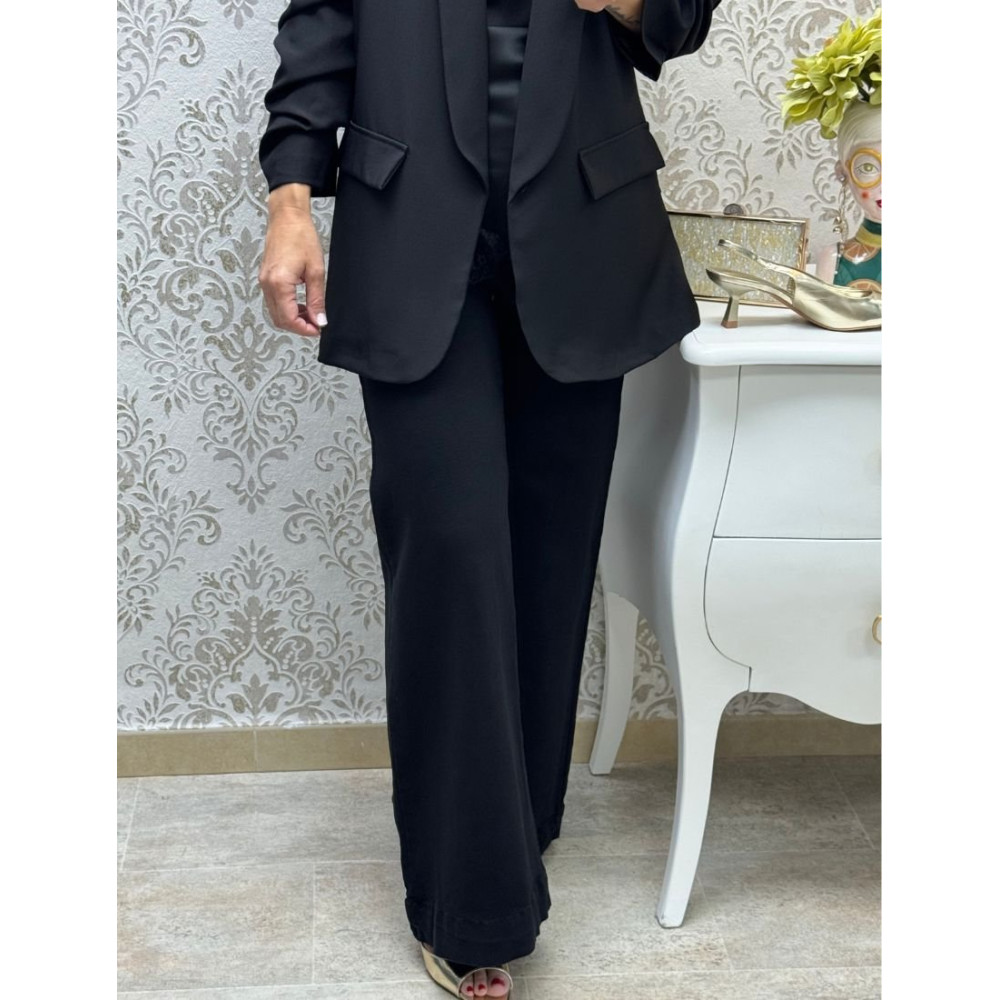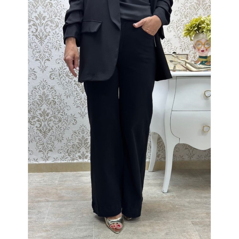 Pantalón de corte pata de elefante confeccionado en tejido de color negro sólido. Presenta un diseño de tiro alto con cintura ajustada y pernera ancha que cae de forma fluida desde la cadera hasta el bajo. Incluye bolsillos funcionales en la parte delantera y un cierre frontal oculto con botón y cremallera.